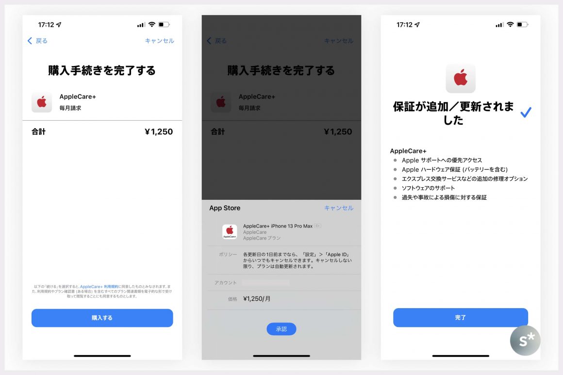 | メリット | ・iPhone購入から30日以内であれば、iPhoneの設定アプリから簡単に購入可能 ・月単位で解約が可能(こちらも設定アプリからなので簡単) ・2年以上の保証も可能 |