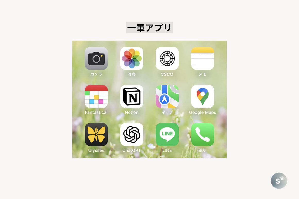 そしてその下には、僕がよく使う一軍のアプリたちを置いています。