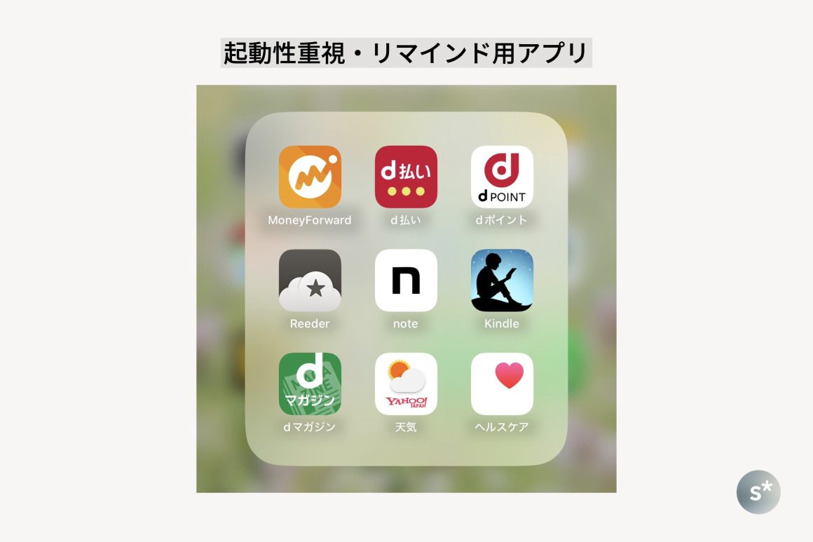 目に付かない場所に置いてしまうと、そもそもそのアプリの存在を忘れてしまうことがあります。そのため、一等地であることを逆手にとって、「重要なのにいつの間にか忘れてしまう」ようなアプリを置くといい。