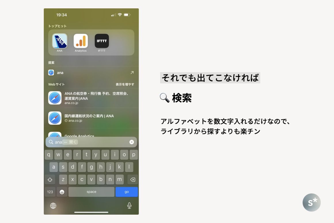 ブランド名や通称での検索にもある程度対応してくれるので、「正式名称なんだっけ…」と考え込むこともありません。Appライブラリからアイコンを目視で探すよりも、全然楽チンですね。慣れたら1〜2秒で目的のアプリに辿り着けます。