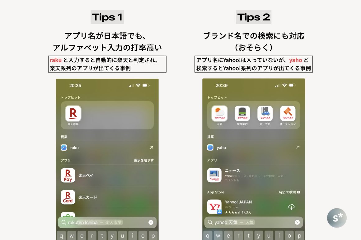 このSpotlight検索、アプリ名が日本語でも、ローマ字やアルファベット表記で高確率でヒットします。つまり、「raku」と打てば楽天系のアプリが候補に出てきます。