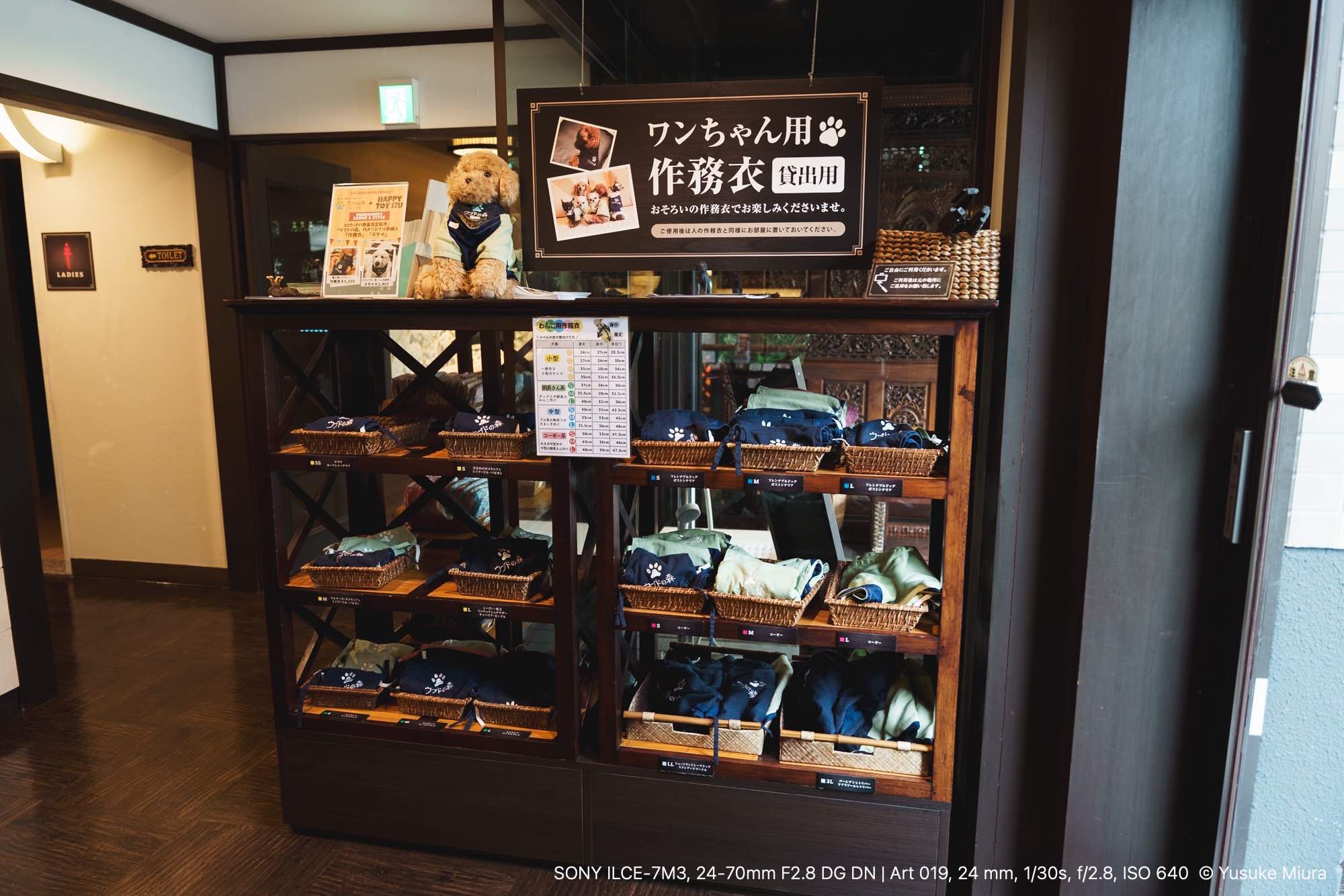 人間用の作務衣はお部屋にあったのですが、なんとフロントの前には人間とお揃いの犬用作務衣が準備されていました。早速着てもらって、温泉宿に泊まっている気分を味わってもらいます。いや、人間が味わってるだけか。