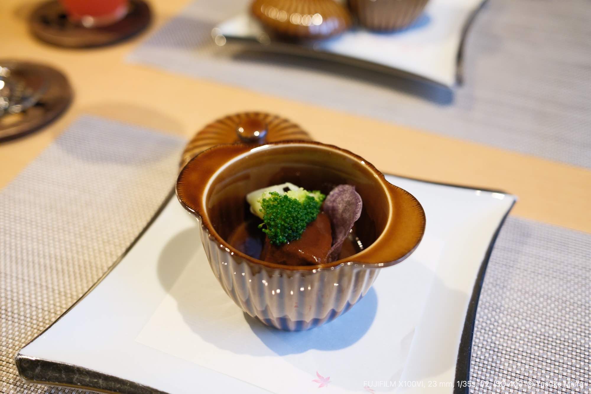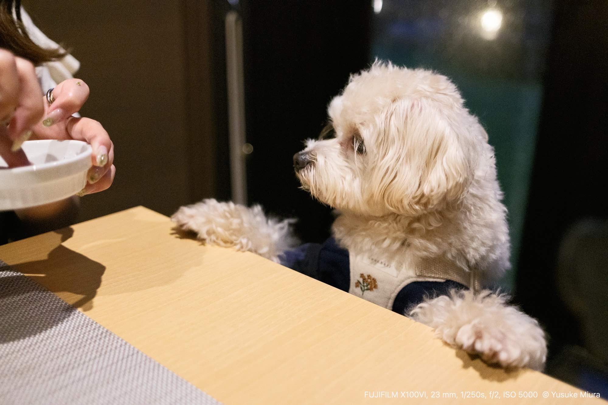 離れの宿泊客は、食事のときは個室に通してもらえます。犬用のスペースもあるから連れて行くことができるし、犬用のごはんまで用意してあるのです。犬OKでもレストランに連れて行くのは不可な宿もある中で、ここは非常にドッグフレンドリーでした。