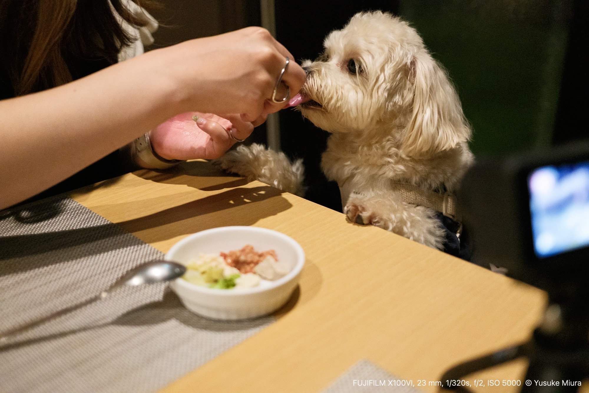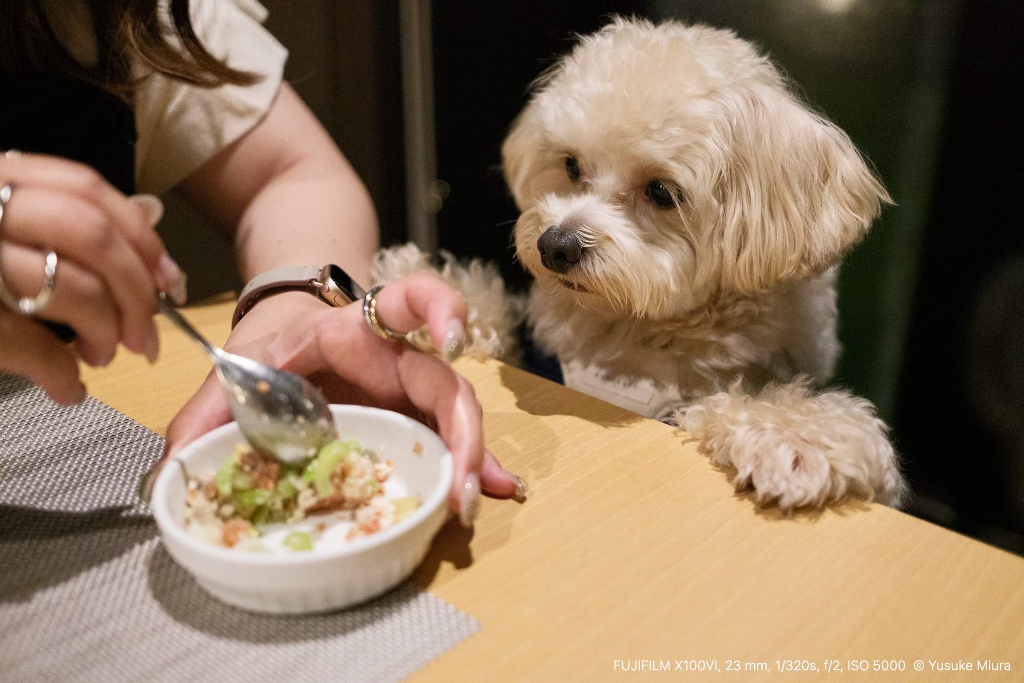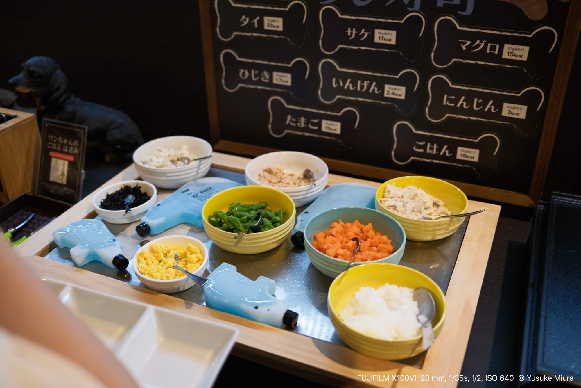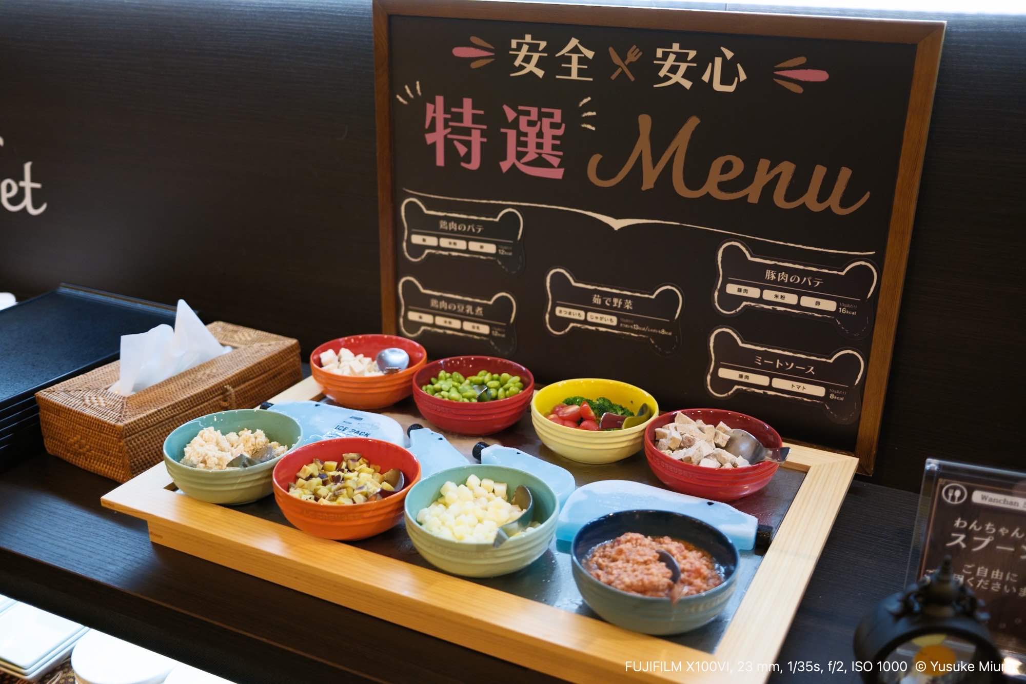 犬にはブッフェがありました。味の付けられていないお肉やお魚、そして野菜など、犬にも旅行気分を思う存分味わってもらいます。
