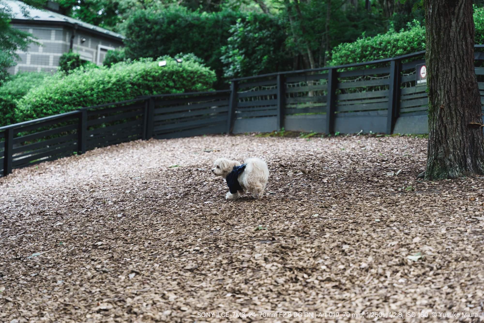まだまだ時間があるので、中庭のドッグランでひとっ走りして帰ることにします。というのも、前日はチェックイン直後のゲリラ豪雨のおかげで、このドッグランを楽しむことができなかったのです。自然の中に木があって斜面になっているようなドッグランは貴重なので、目一杯楽しんでもらいます。いつかの蓼科旅行を彷彿とさせるようなドッグランでしたね。