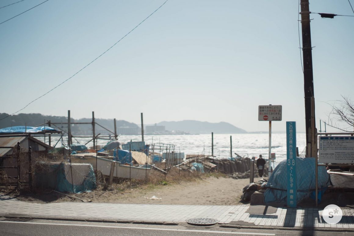 お店から由比ヶ浜までは徒歩1分。横断歩道を渡るだけです。雲ひとつない快晴なので、少しお散歩してから帰るとしよう——と思ったのですが、強風が吹き荒れており、一歩砂浜の中に足を踏み入れると目や口の中に砂が入ってきて大変でした。やむなく退散しました。