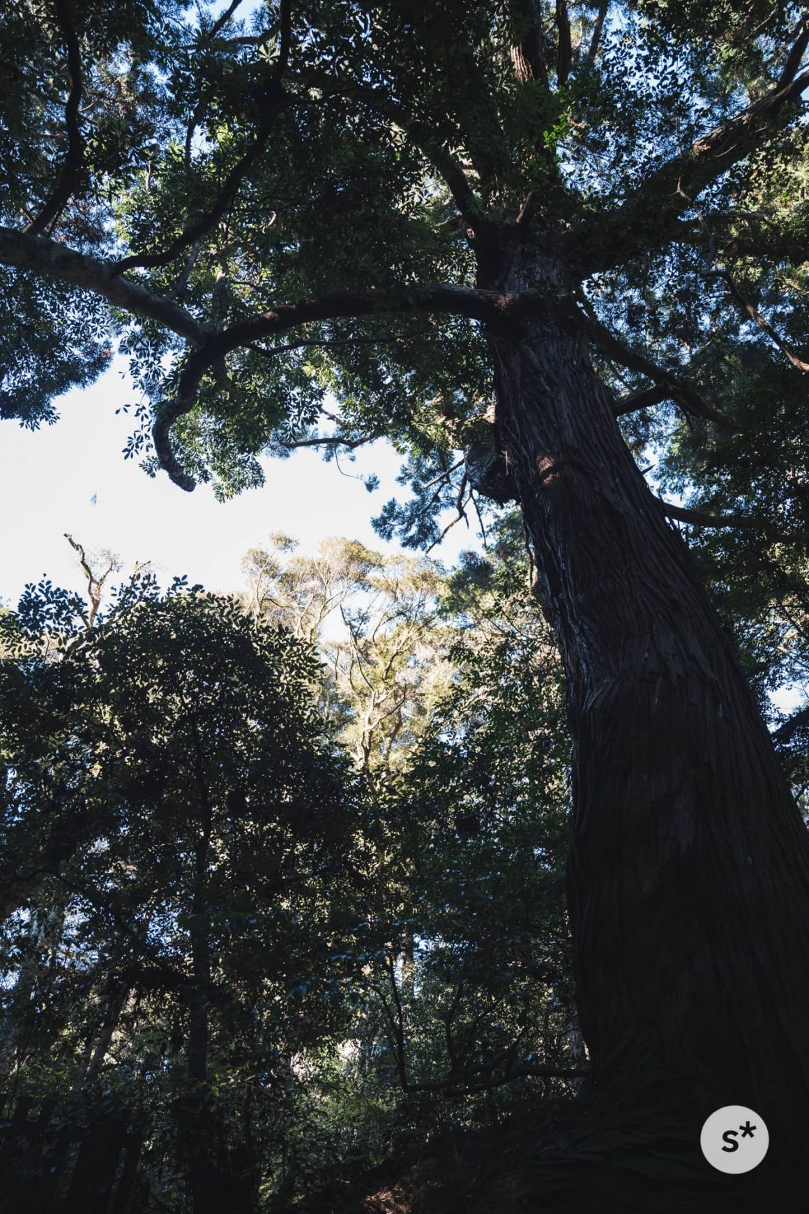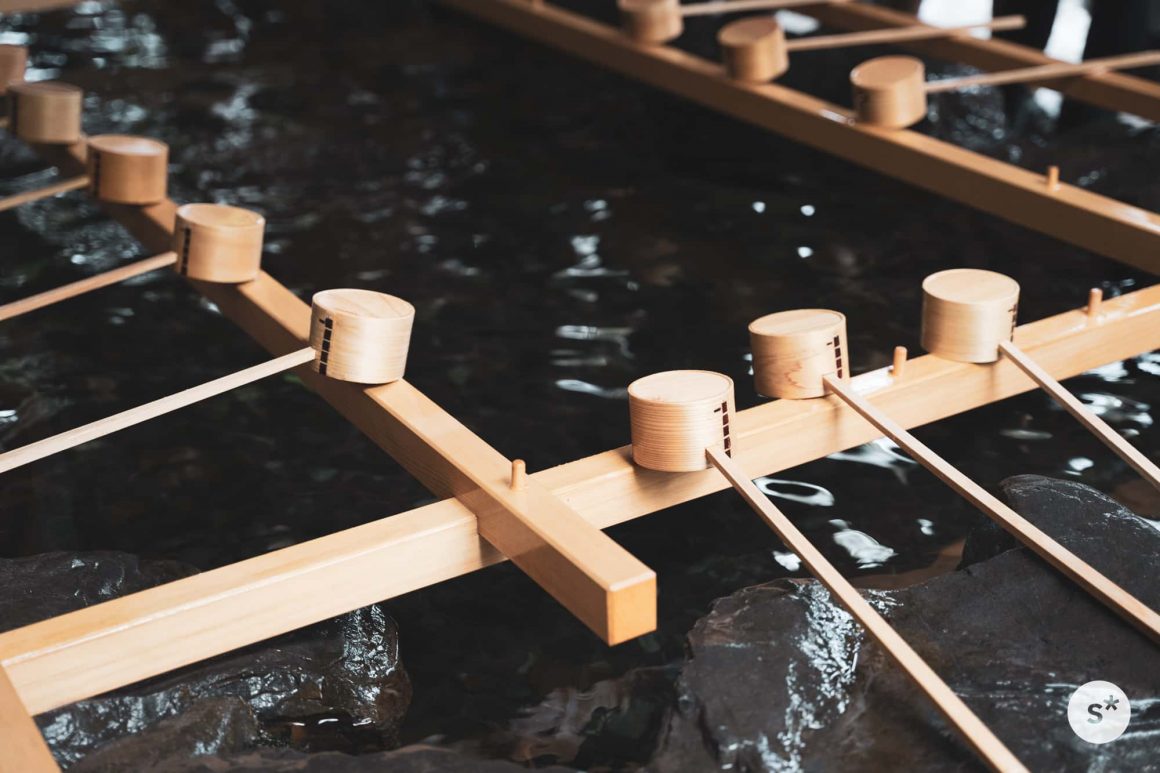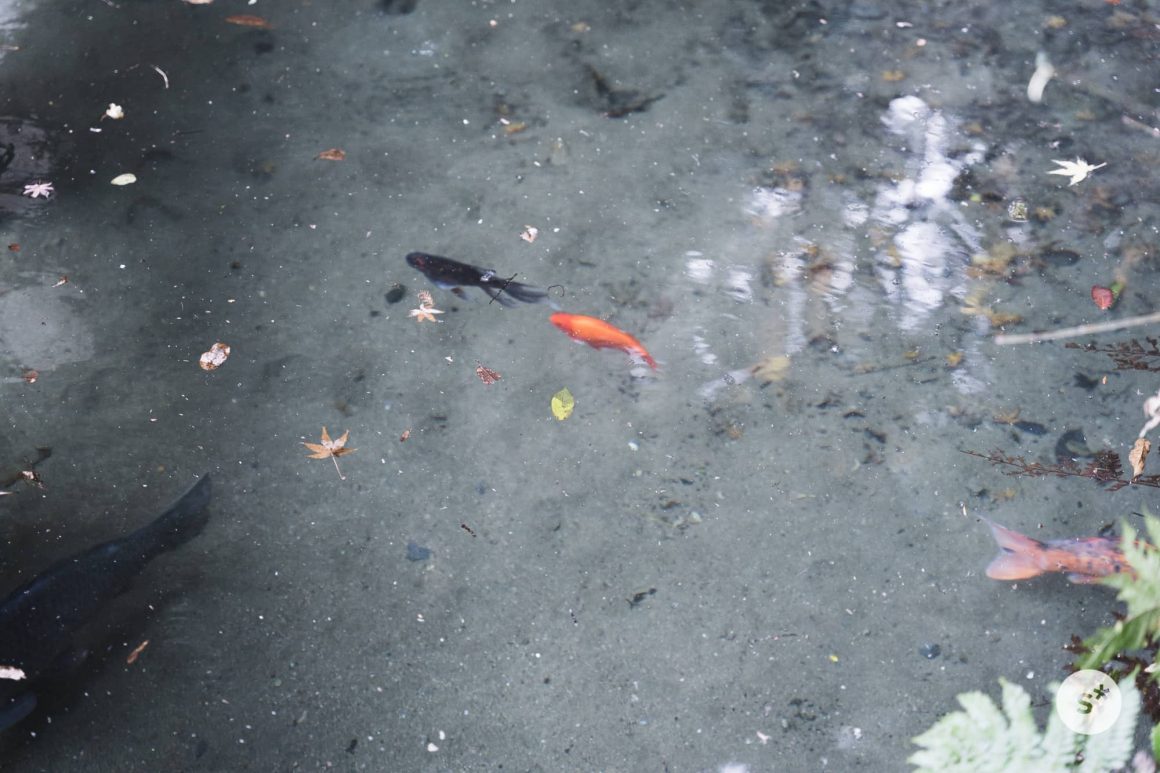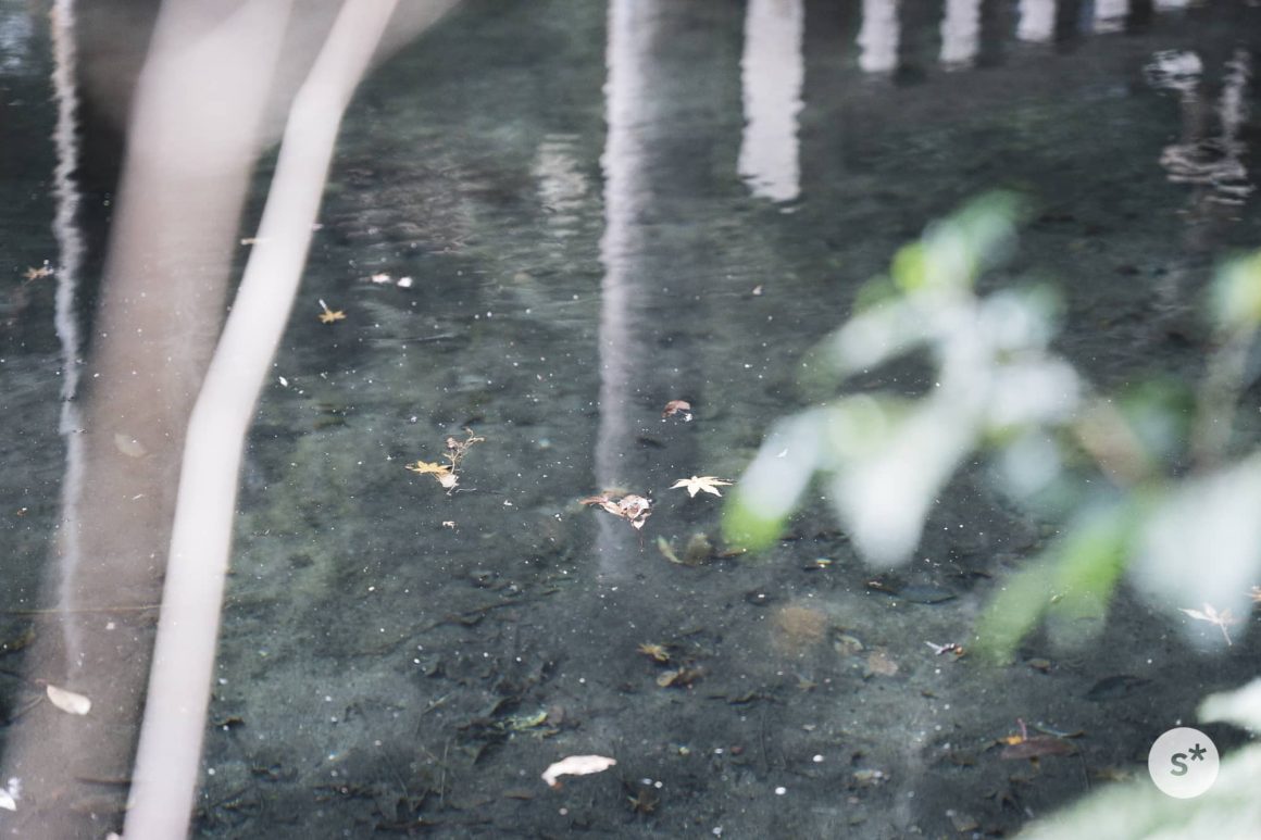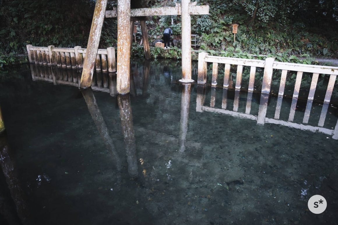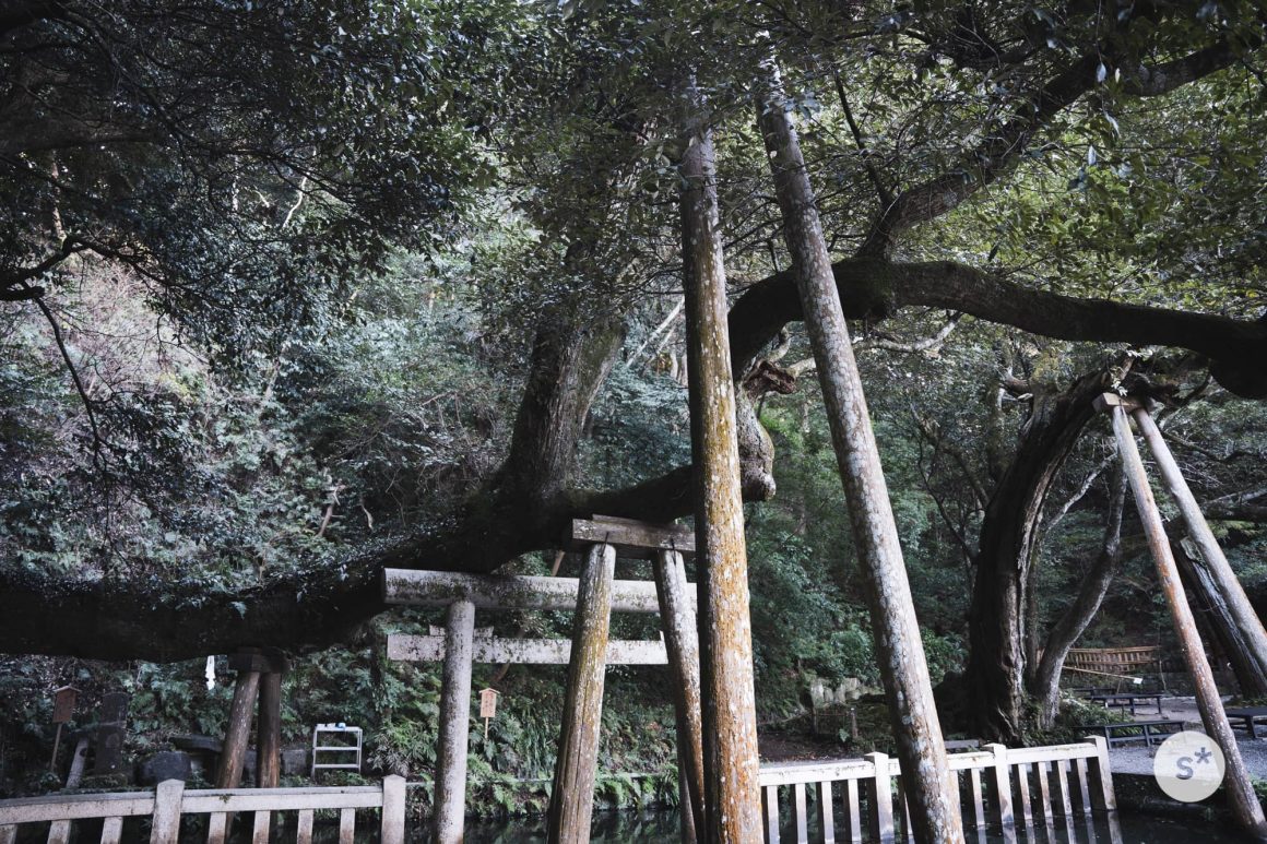 奥宮は写真に撮るのが憚られたので、御手洗池にやってきました。真横に向かって生えている木が倒れないように支えてるよ、すごい。