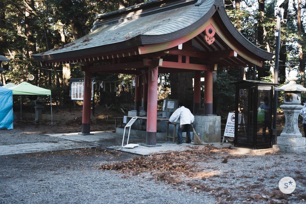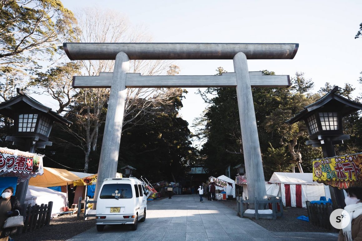 時刻は午前8時すぎ。がんばって早起きして車に乗り、首都高と東関東道を飛ばしてやってきました。駐車場代300円を払って車を止め、大鳥居の前へ。境内では翌日からの三が日に備えて出店の準備が進められていました。