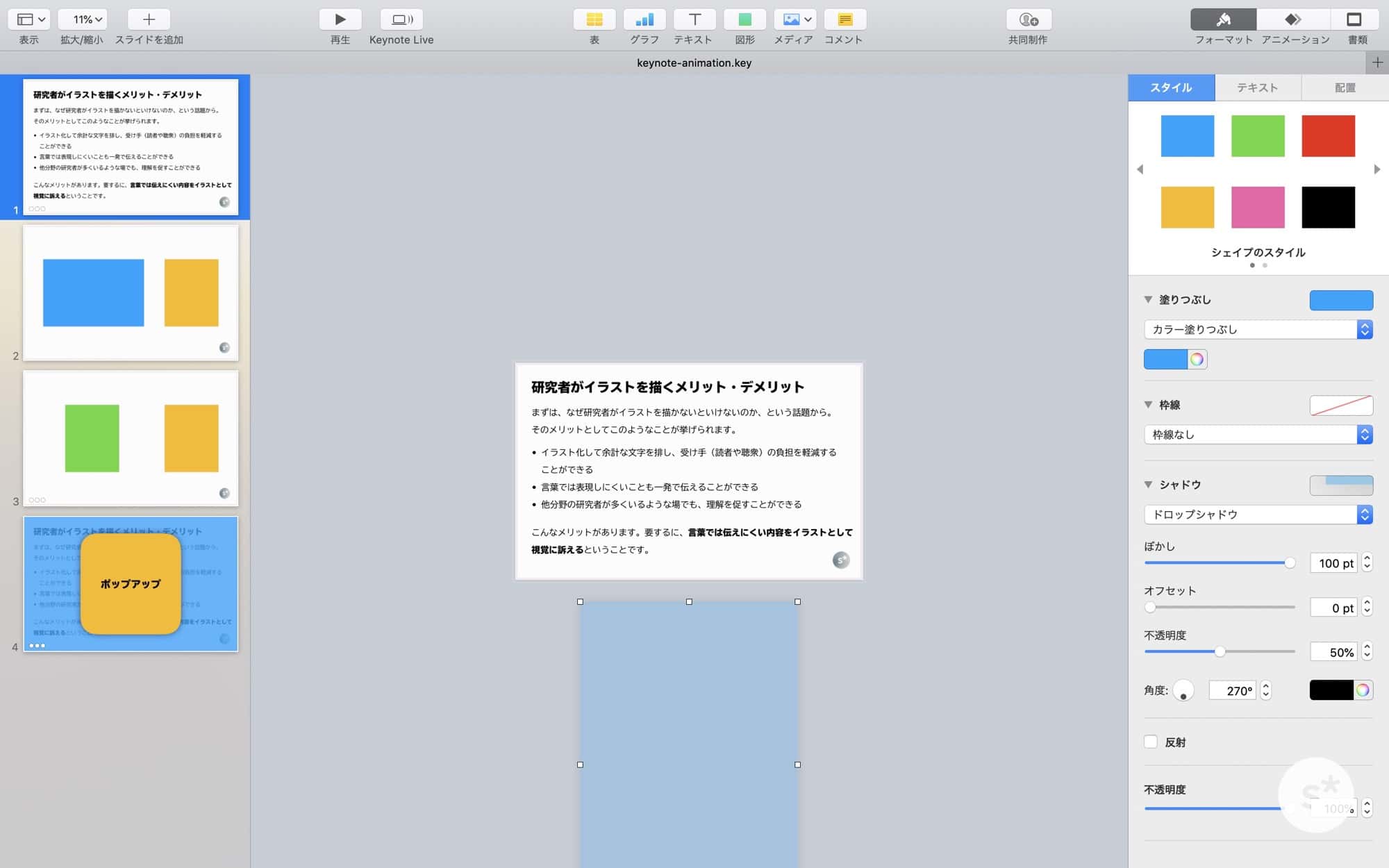 プレゼンのときに余計なアニメーションを使いまくるとウザがられますが、自然なアニメーションを適切な場面で使うことで、視覚的ノイズが減り、聴衆の理解が深まると考えます。
