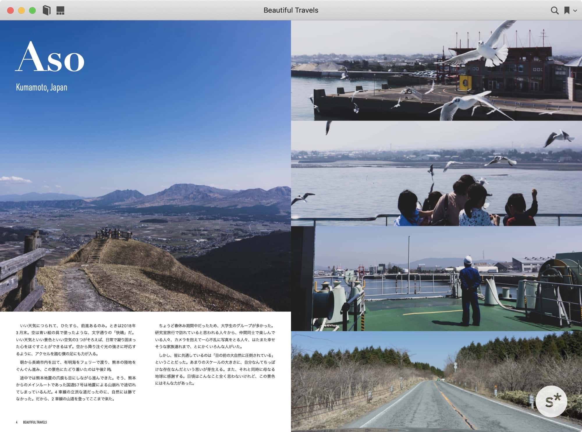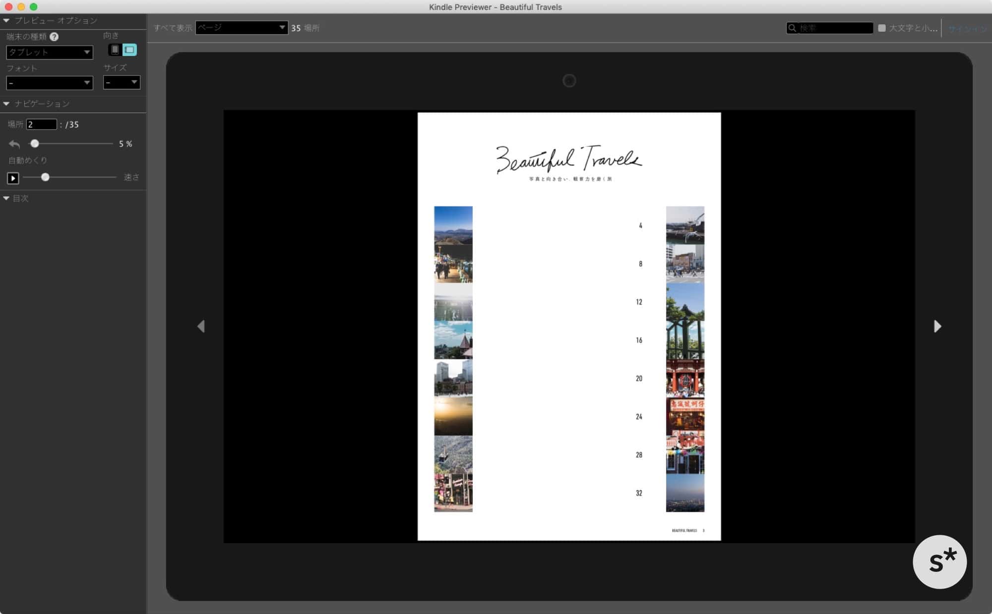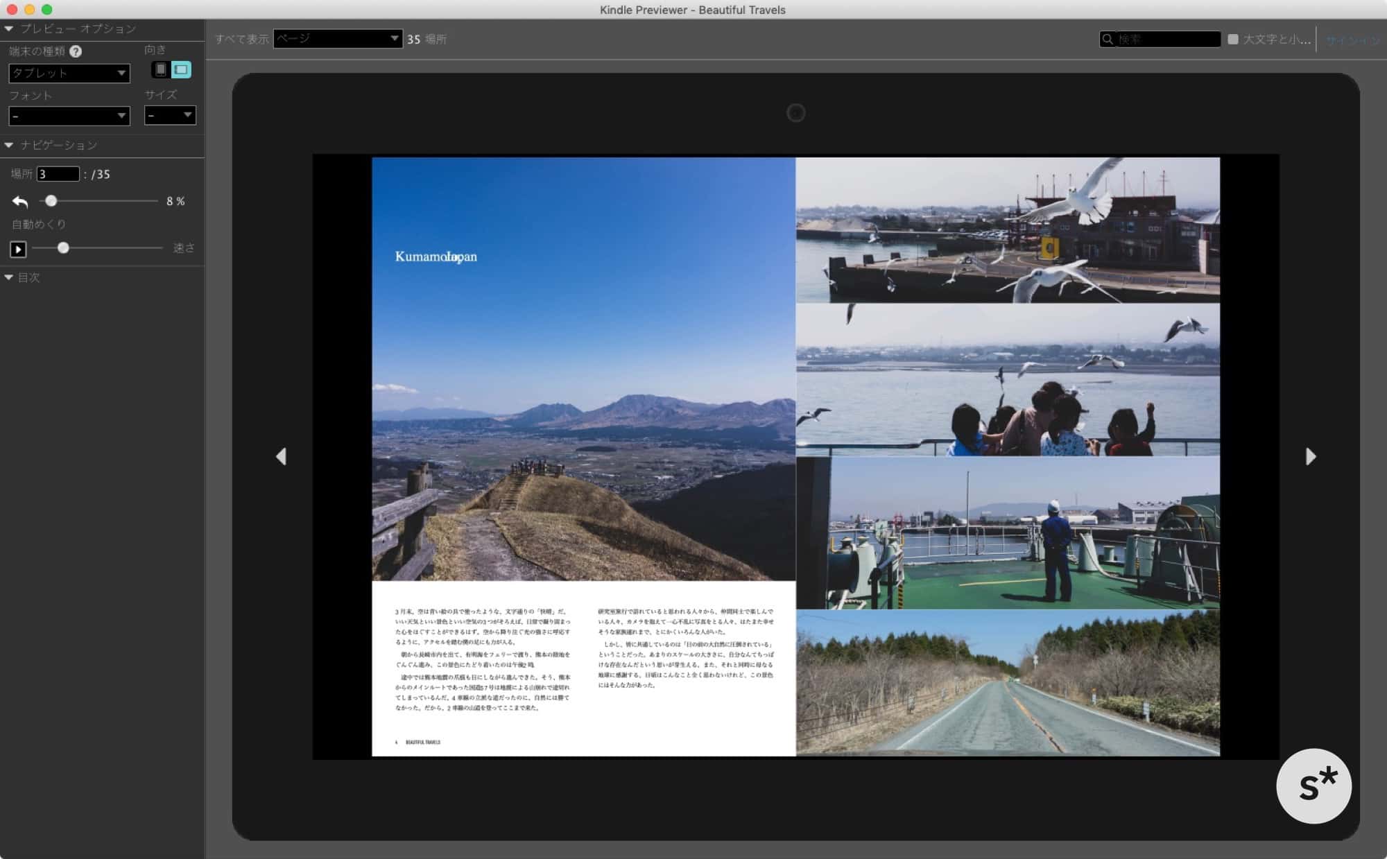 InDesignでは電子書籍の標準フォーマットであるePub形式で書き出すこともできますが、今回の旅ZINEの場合はこのMobi形式への変換の際にデザインが崩れてしまいました。