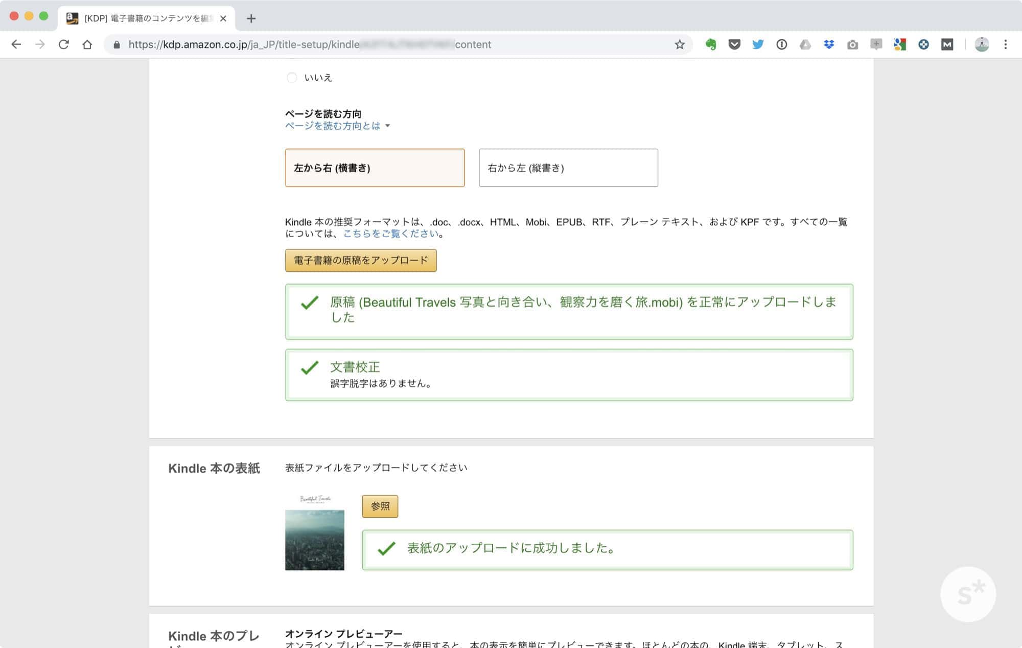 あとはブラウザからKindleの出版ページを開き、紹介文を書いた上で入稿します。前述のように、中身はMobi形式で、表紙はJPEG形式で入稿するといいでしょう。