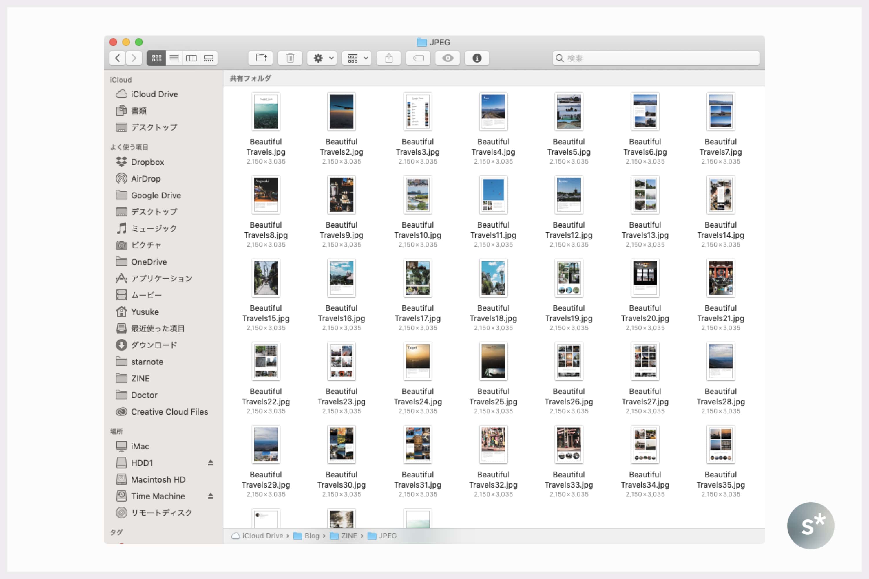 まずはInDesignから各ページをJPEG形式で書き出します。Finderで見るとこんな感じ。