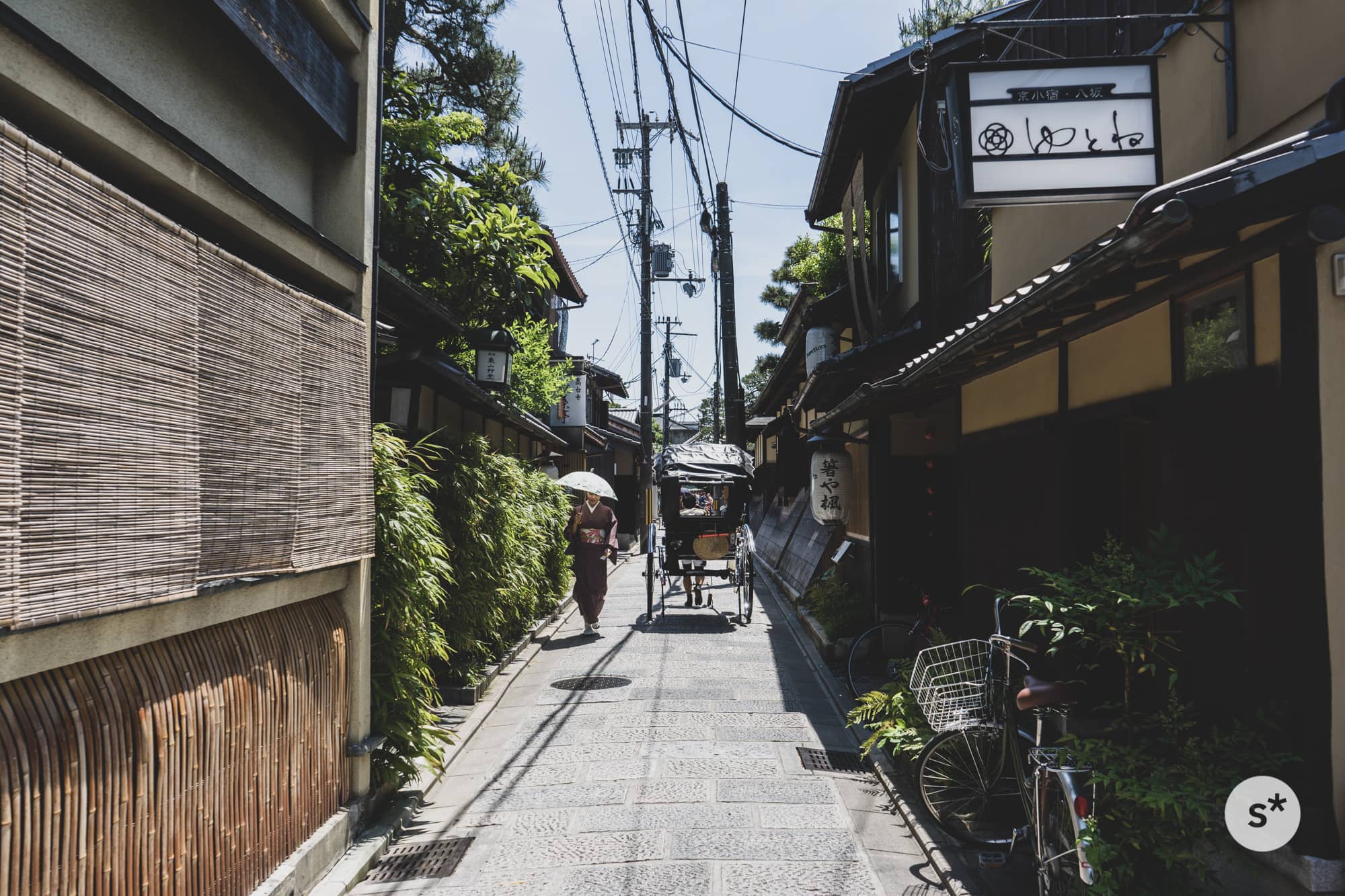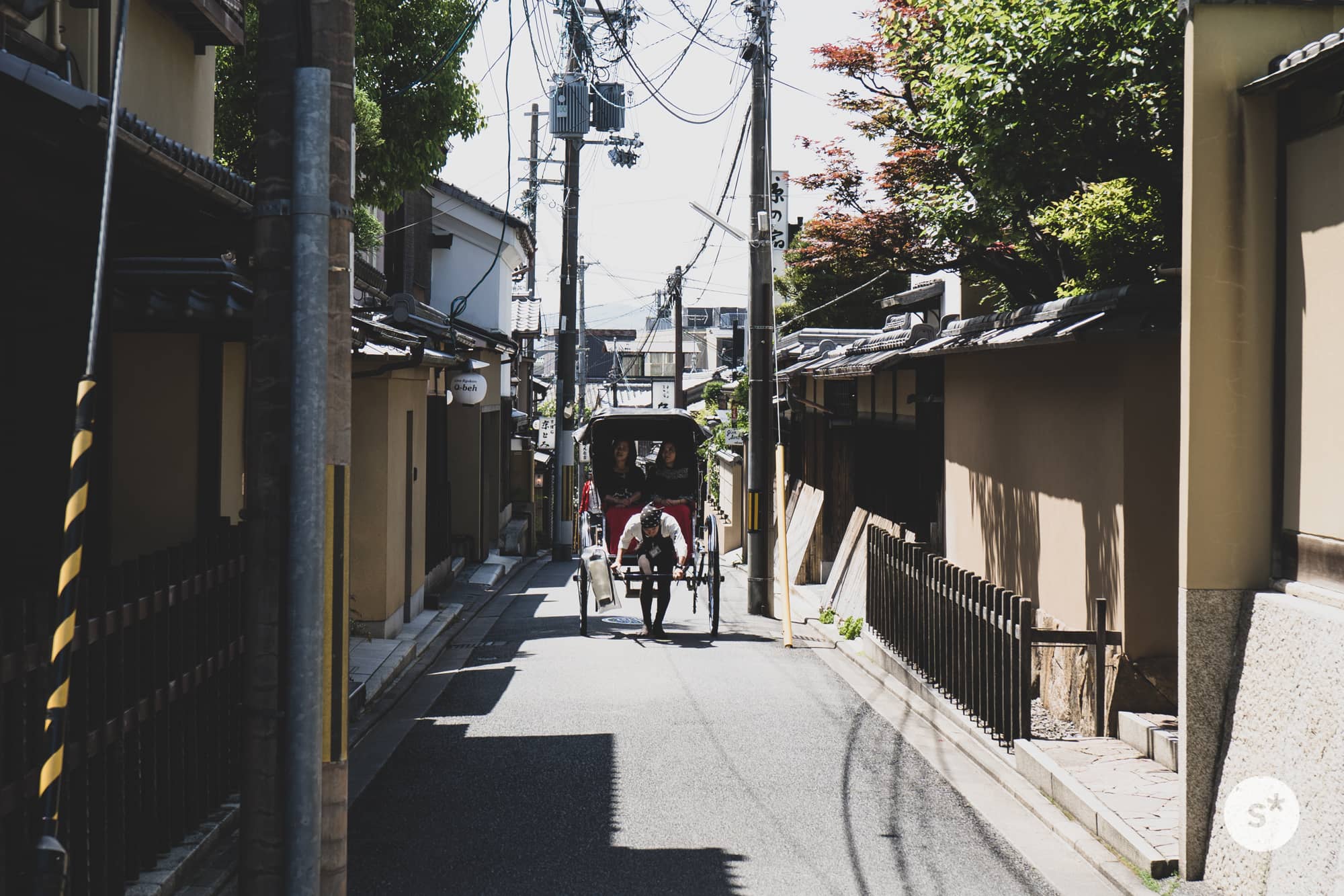 ベストショットが撮れたと、心の中でガッツポーズをした1枚。人力車と着物姿の女性がすれ違う路地を、情景豊かに撮影することができました。