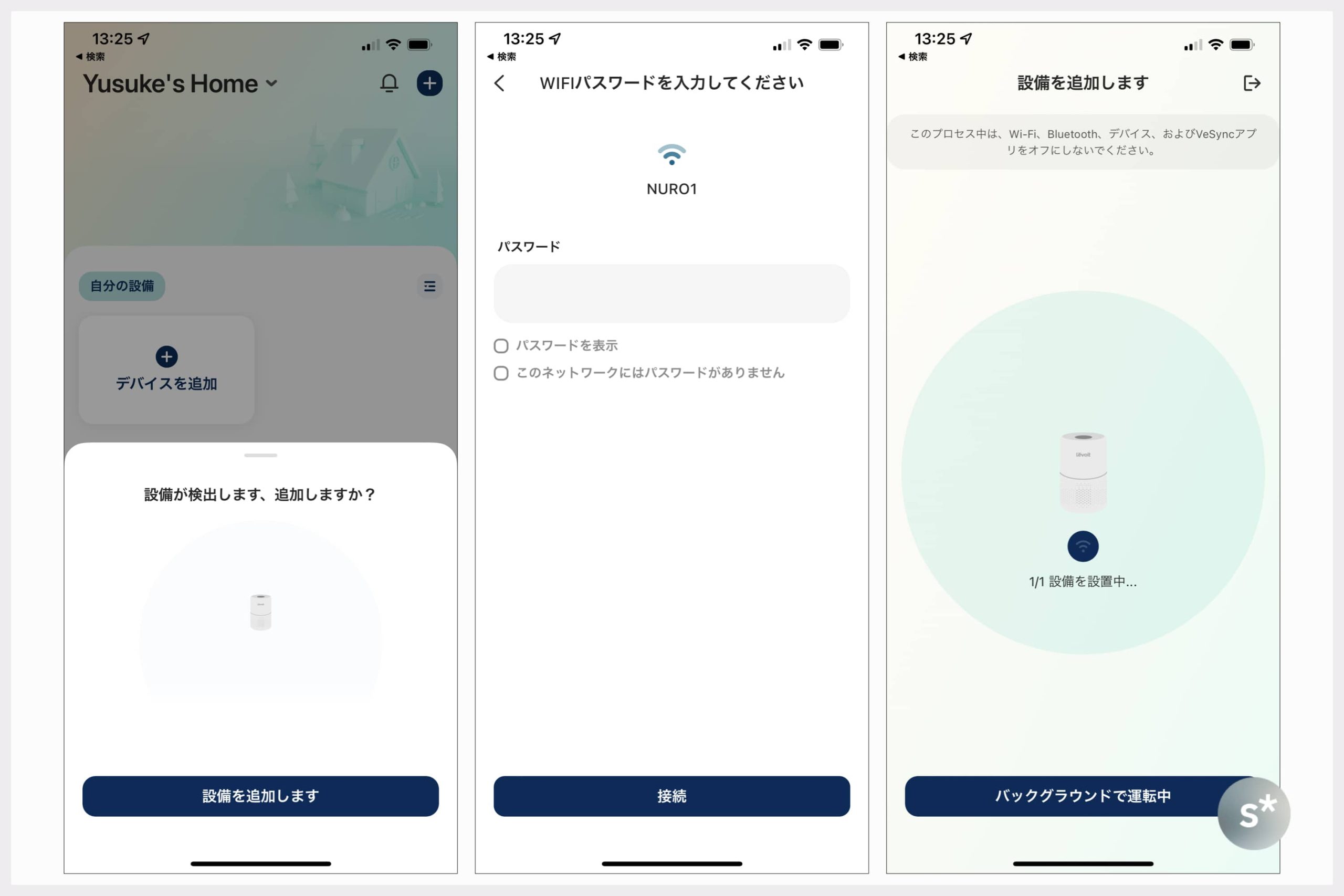 その後、Bluetoothでデバイスを検出し、自宅のWi-Fiに接続します。