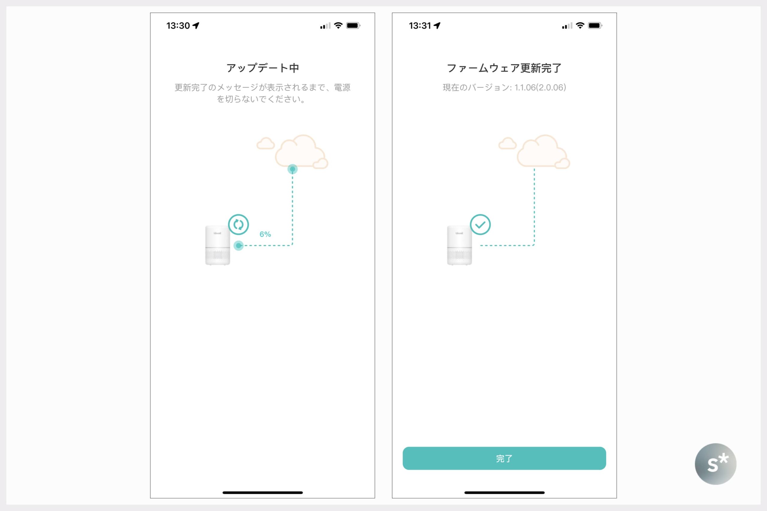 初期設定直後には、空気清浄機本体側のファームウェアの更新が入るかもしれません。といっても、画面の指示にしたがって2〜3分待つだけです。