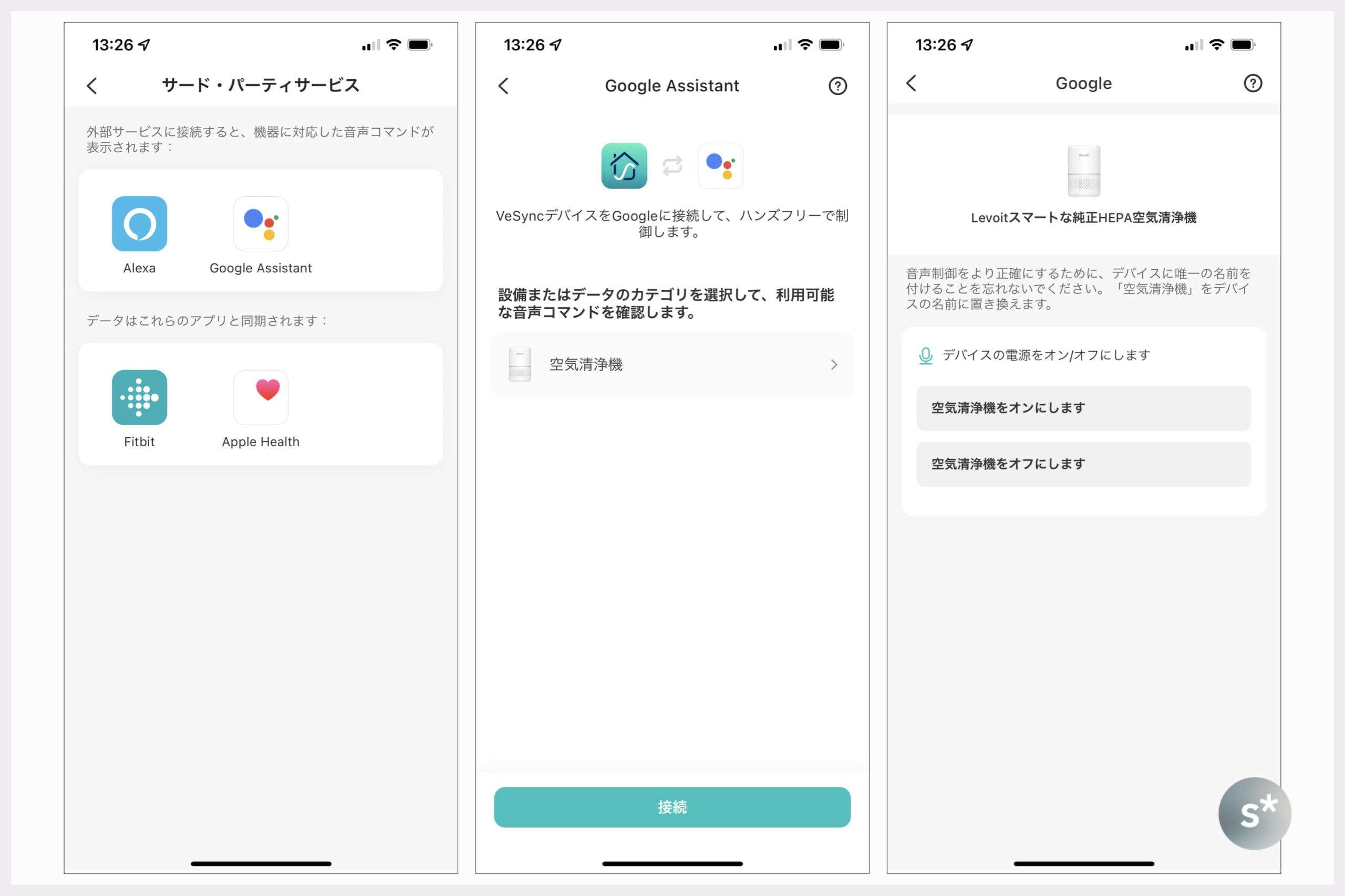 Googleアシスタントのセットアップも簡単です。VeSyncアプリから「サードパーティーサービス」の設定に入ると、Googleアシスタントとリンクさせることができます。