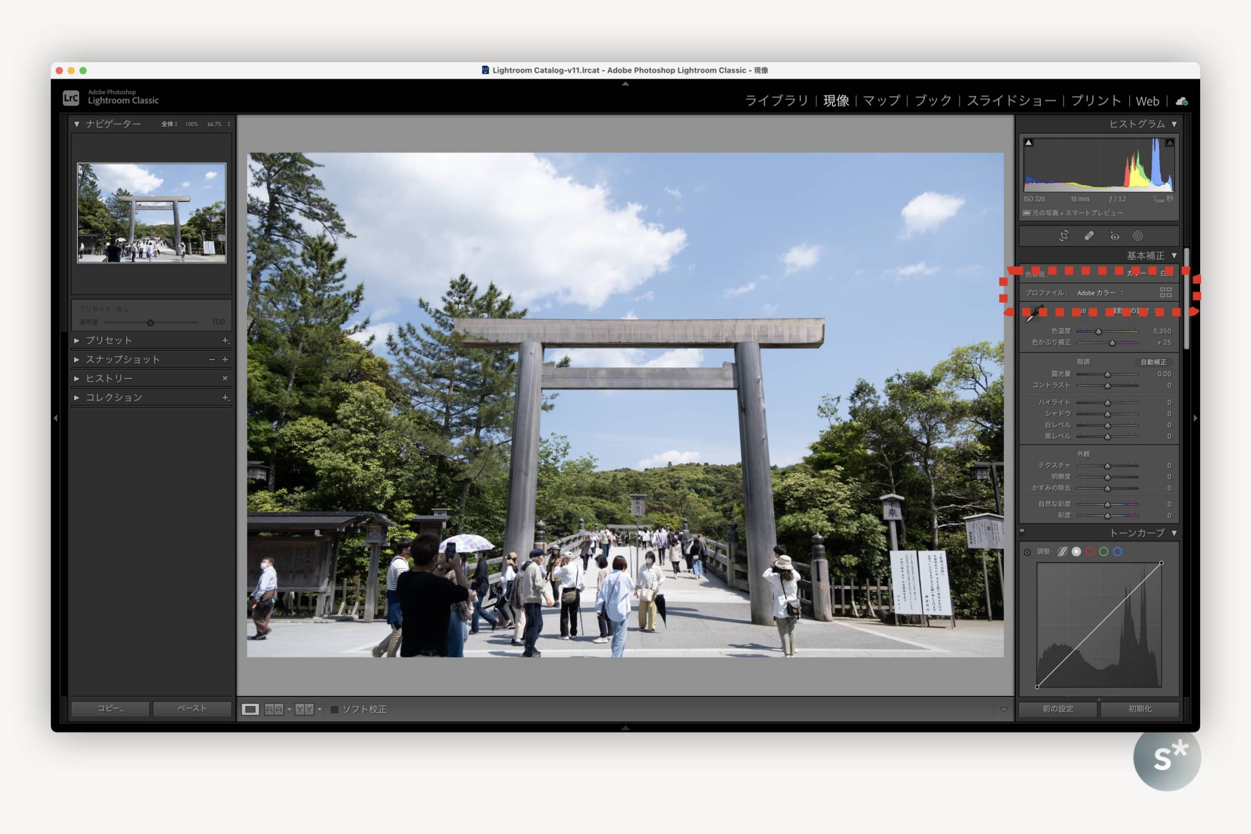 下の画像は、未処理のRAW画像に対してカラコレや傾き補正などを行った上で、クラシックネガを当てています。伊勢神宮の記事で使った写真は全てこのようにして準備したものです。
