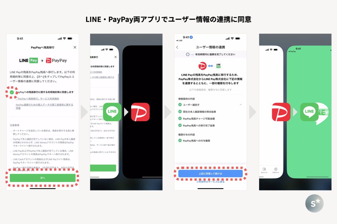 残高移行の画面で「PayPayへの残高移行に関する利用規約等に同意します」にチェックを入れて「次へ」をタップ。するとPayPayアプリに遷移して、こちら側でも情報提供に同意します。LINEアプリに戻ったら、準備完了です。