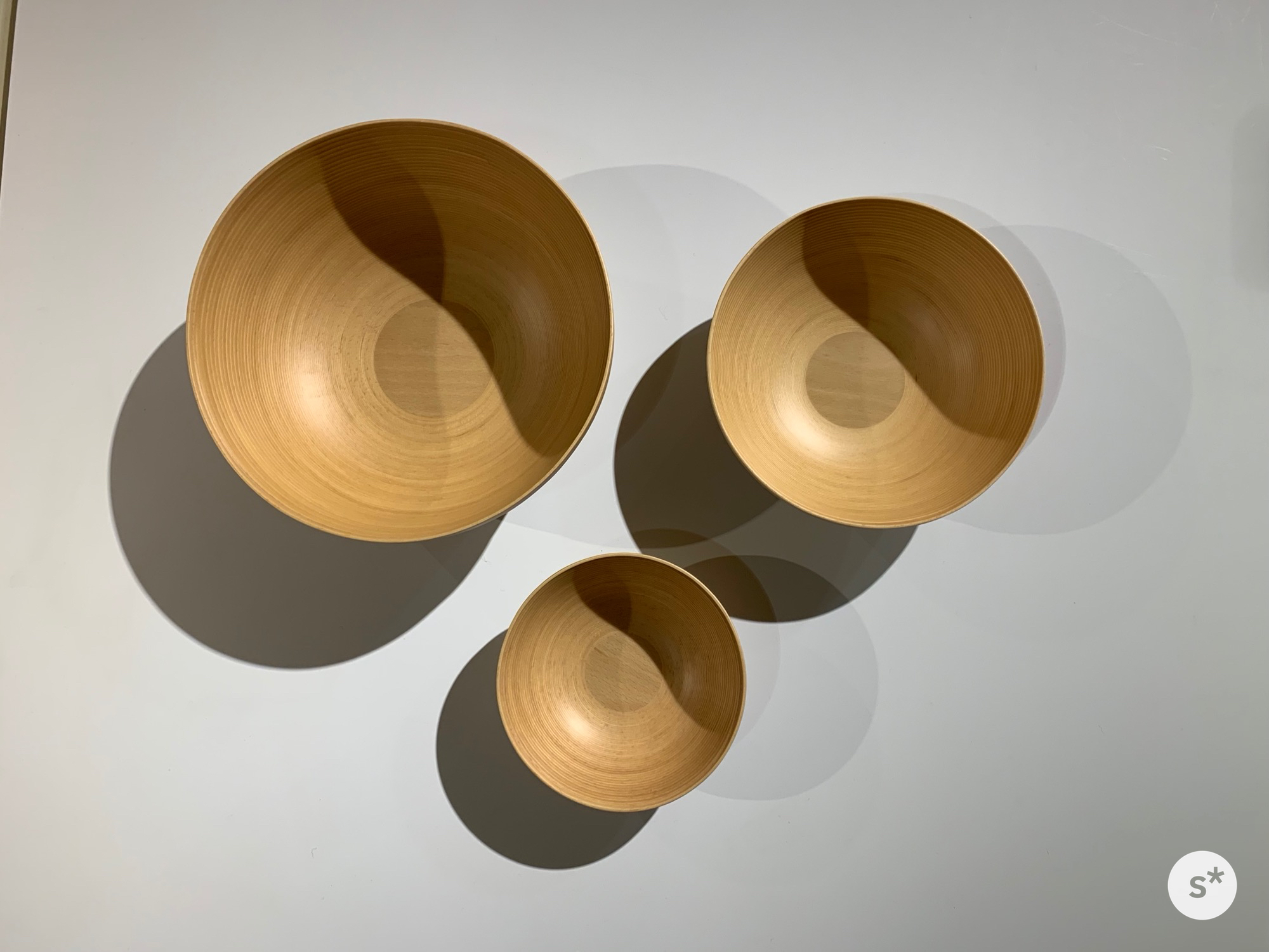 ブナ材を有効活用した新しい工芸品「ブナコ」。「コ」は「コイル」に由来していて、ブナの木を桂剥きのように薄くテープ状にして、それを手作業でコイル状に巻いているそうです。上から覗いたときに見える模様はこれみたい。