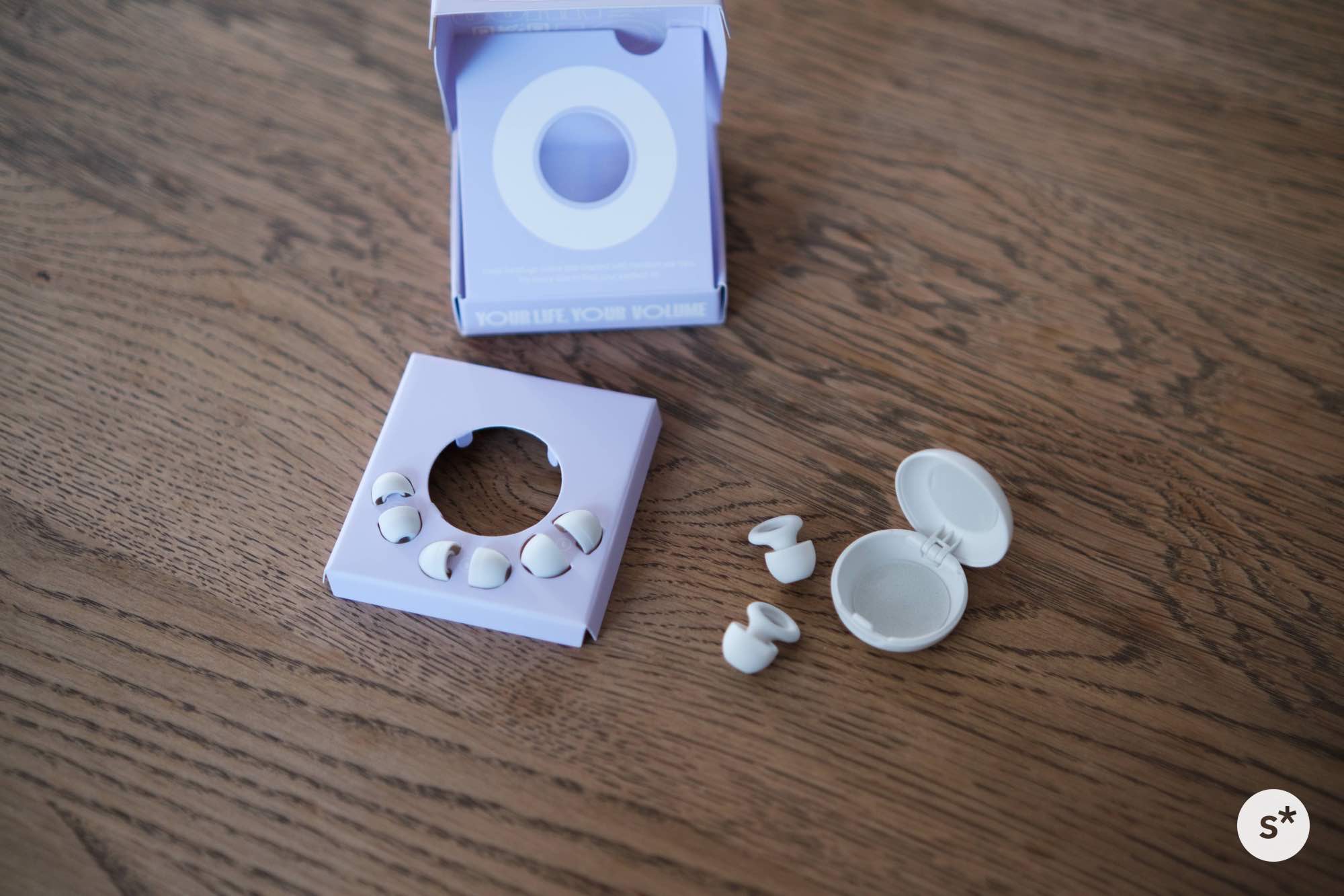 本体の耳栓2つとケース、それから交換用のイヤーピースがセットになっています。