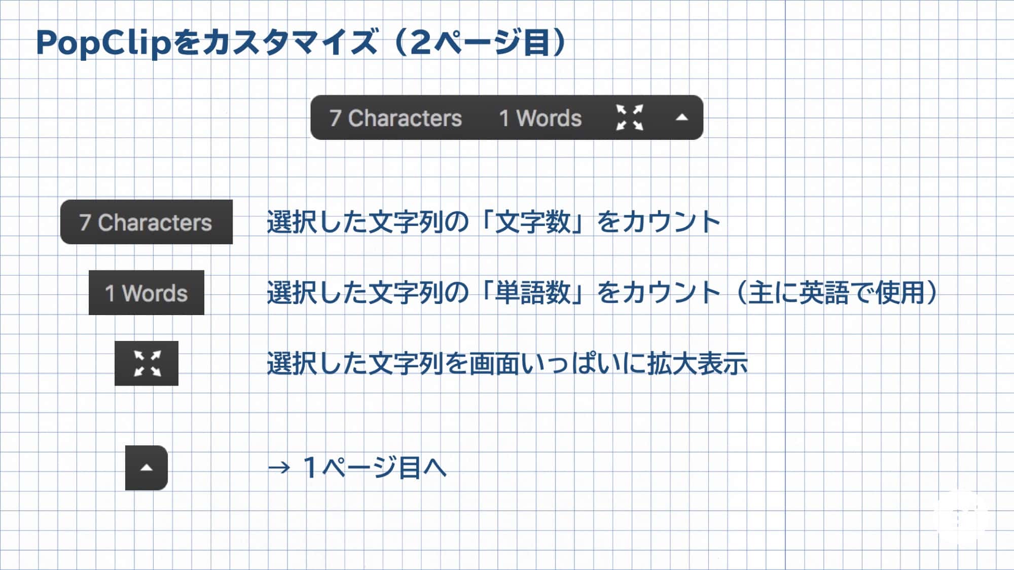 2ページ目には「文字数カウント」や「単語数カウント」などを表示しています。申請書などを書いていると、文字数制限のある文章を書かなければならないことが多いんです。Microsoft Wordなど、文字数が表示されるアプリでは必要ないですが、Webサイトのフォームに記入するときには便利です。
