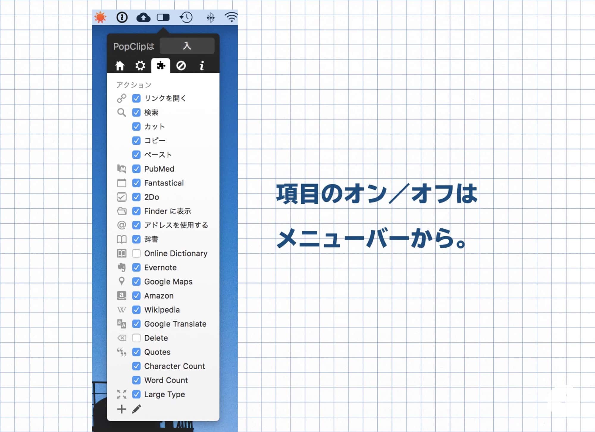 ここまででも十分便利そうですが、PopClipが真価を発揮するのはここから。なんと、表示するメニューをカスタマイズすることができるのです。