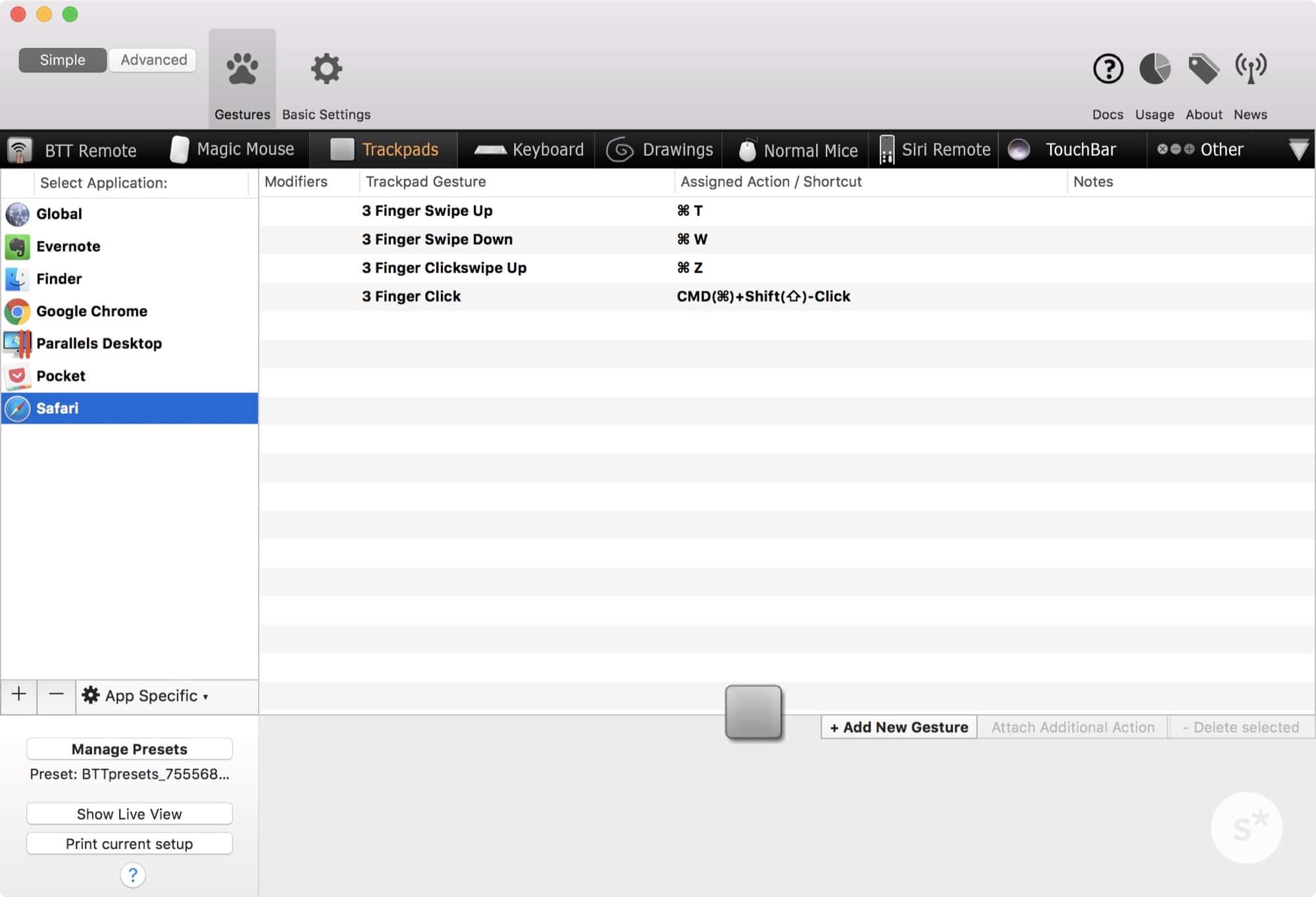 具体的には、「3本指で上にスワイプ」とか「3本指クリック」とか、標準機能では手の届かないジェスチャーを追加することができます。