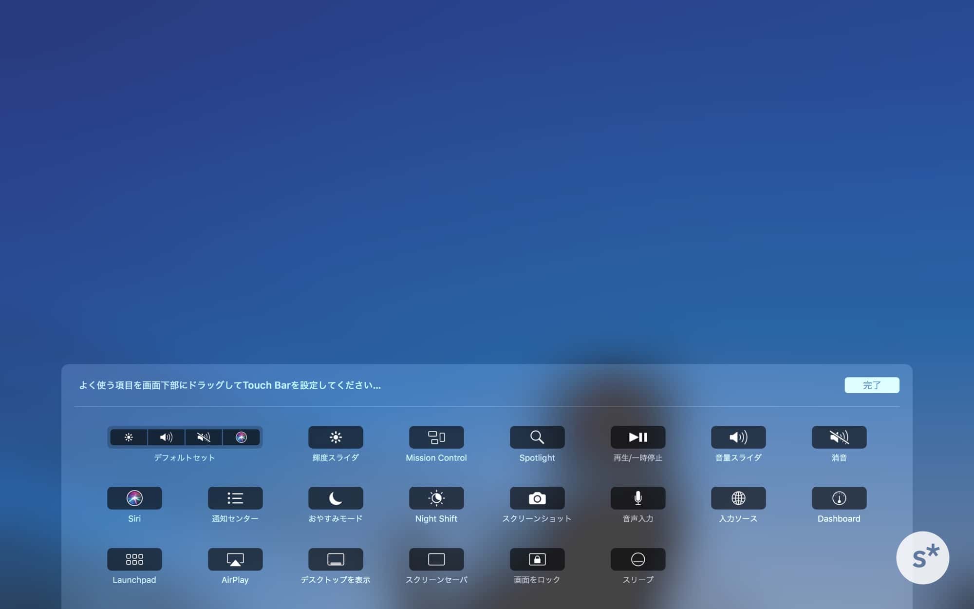 設定は、「システム環境設定 → キーボード → Control Stripをカスタマイズ…」から。下のような画面になるので、使いたい項目をドラッグ&ドロップします。