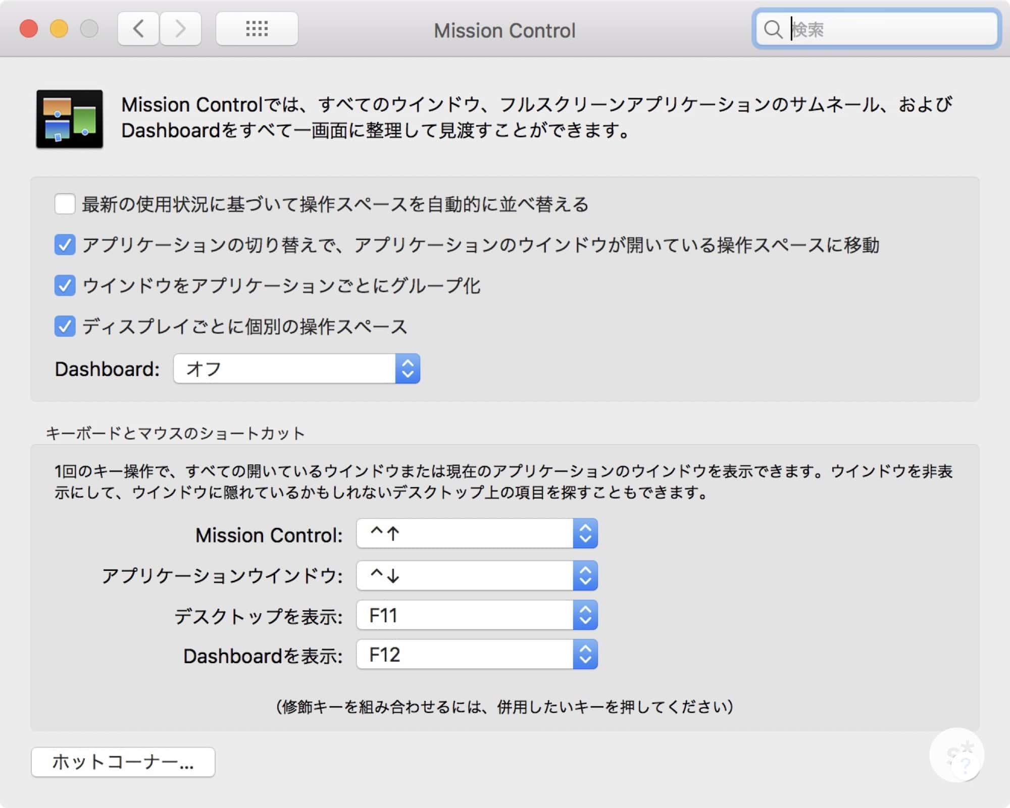 「Mission Control」の設定は「システム環境設定 → Mission Control」から。