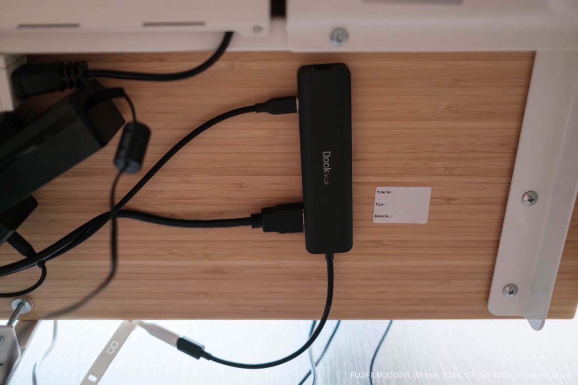 やっとそれが実現できる構成になったのが嬉しい。実はデスク裏にはUSB-Cハブを貼り付けており、ここから延長ケーブルを伸ばすことで、会社のMacBook Proを繋いでディスプレイに投影できる環境を作りました。