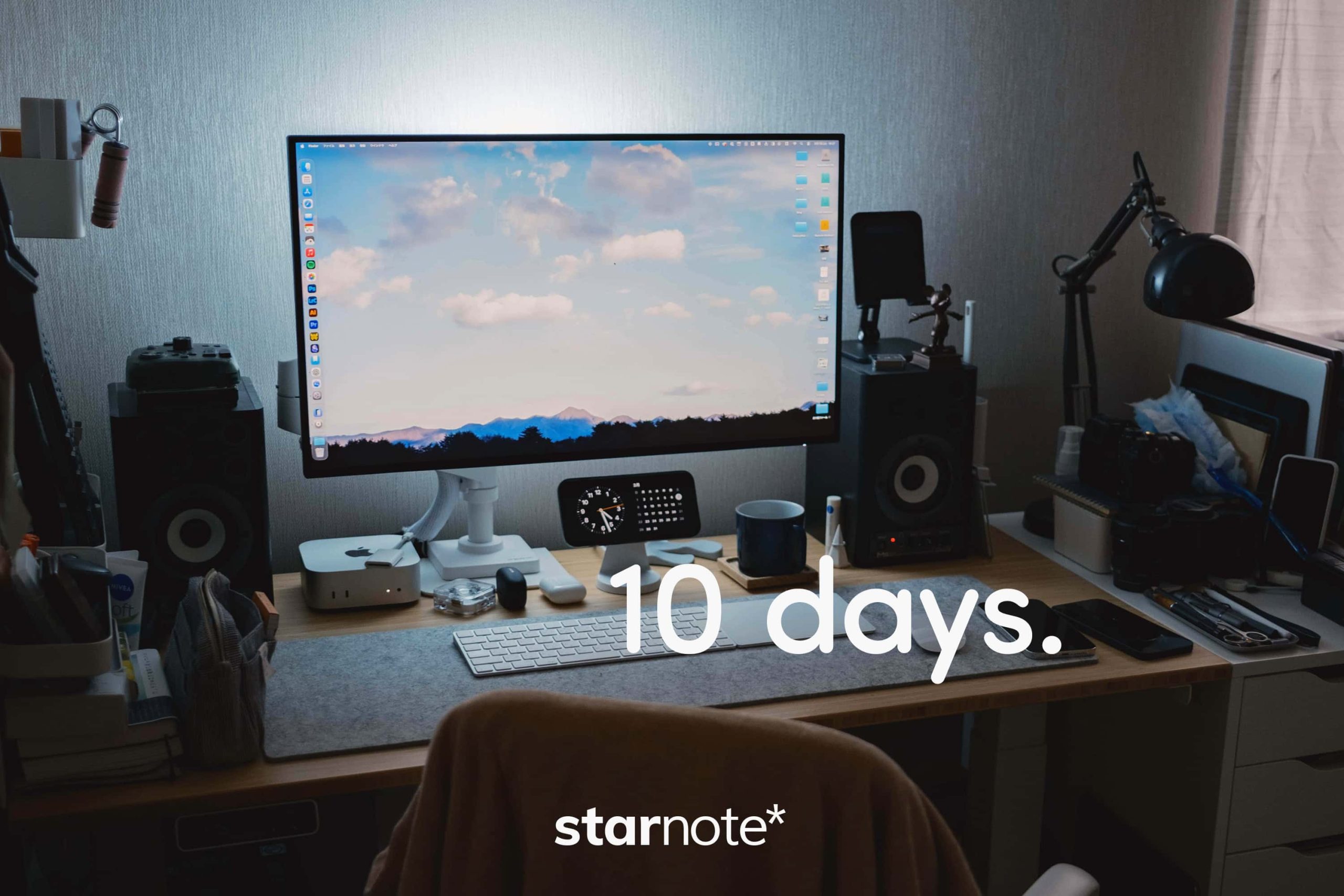 このディスプレイ、四辺ともに狭額縁でかなりスタイリッシュ。モニターアームで浮かせていることもあり、以前のiMacを置いていたデスクとは思えないくらい、かっこいい作業スペースになりました。