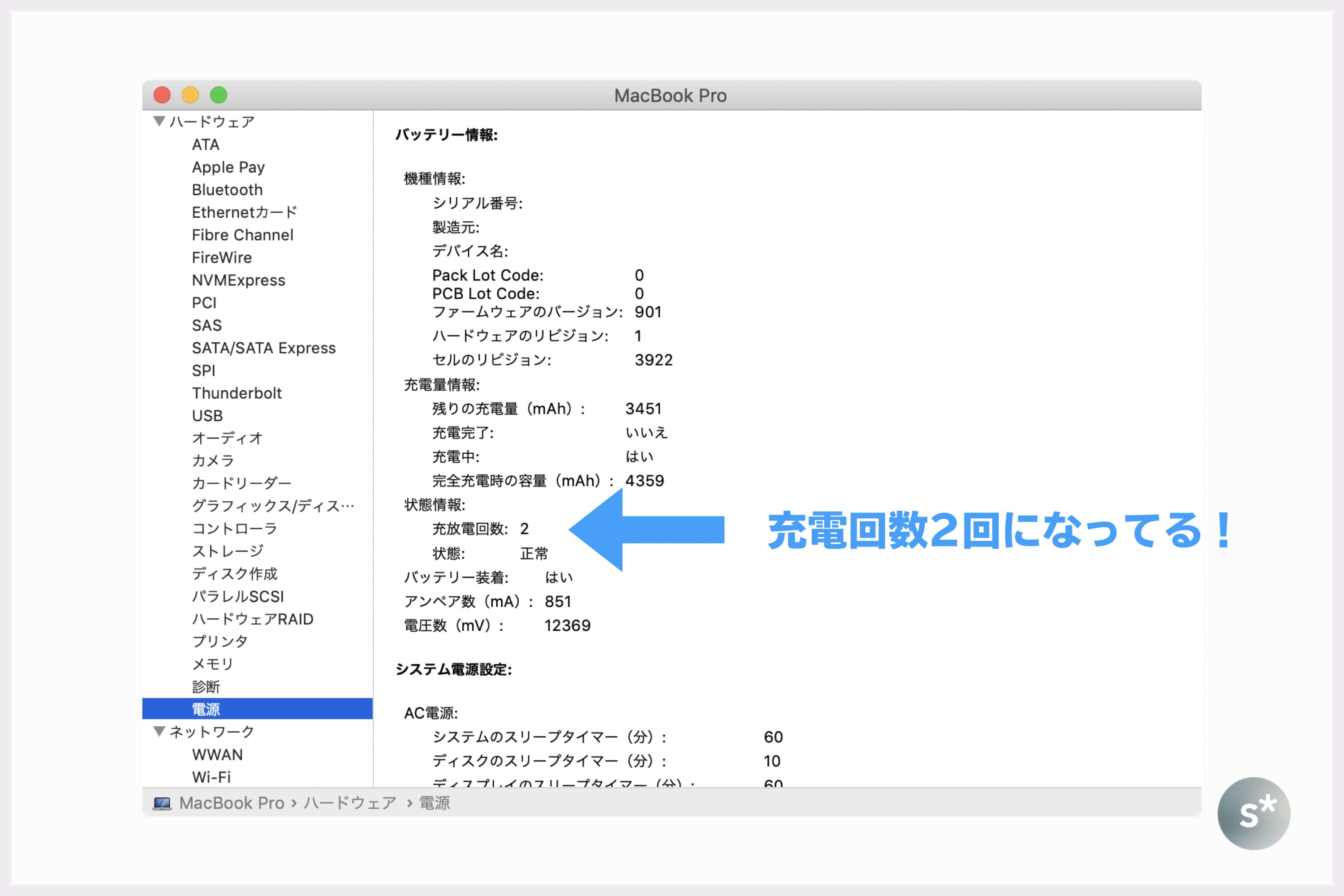 起動してmacOSからシステム情報を参照しても、充電回数2回になっていました。修理に出す前は100回を超えて容量も85%ほどに減っていたので、これは嬉しいなぁ。