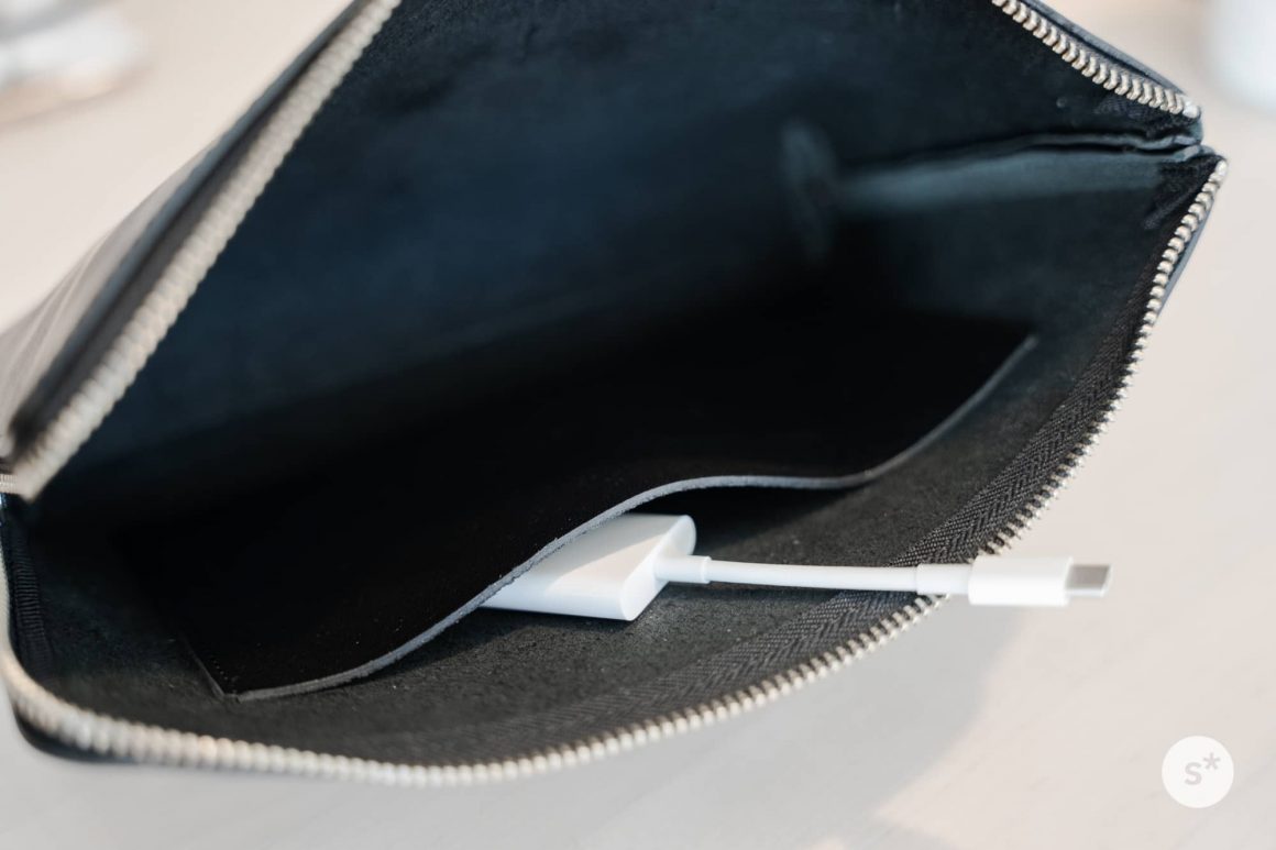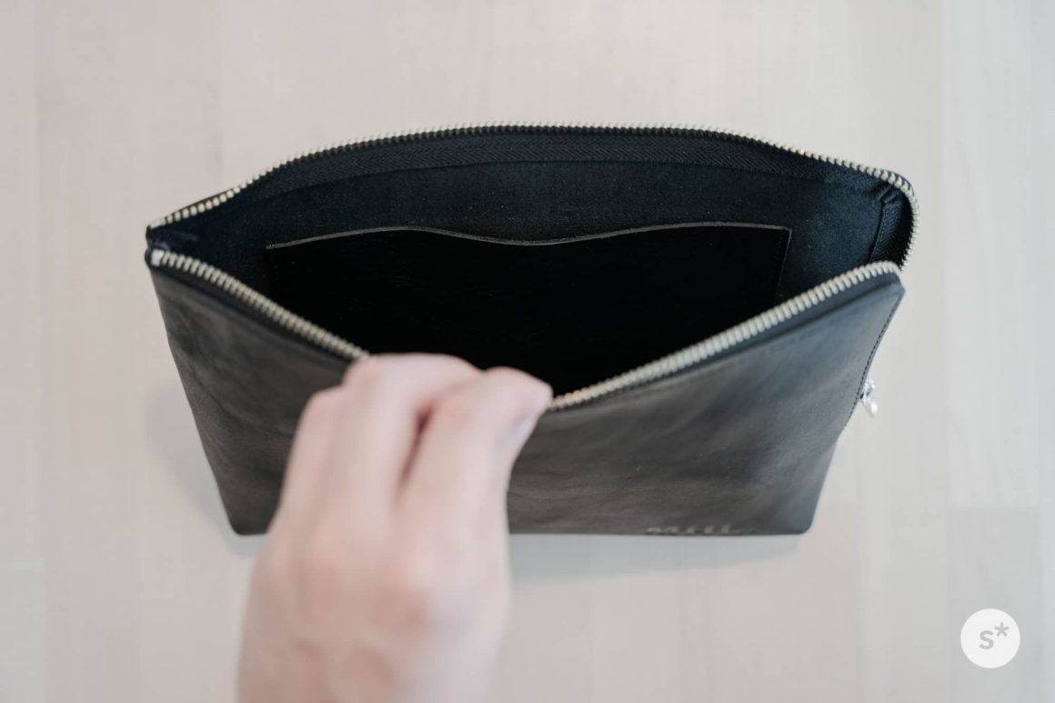 内側にはポケットがひとつ設けられています。マチはないので厚いものは入りませんが、小物類がバラつくのを防ぐのにはよさそうです。僕はLightning – SDカードアダプタなどを入れておきたいと思っています。