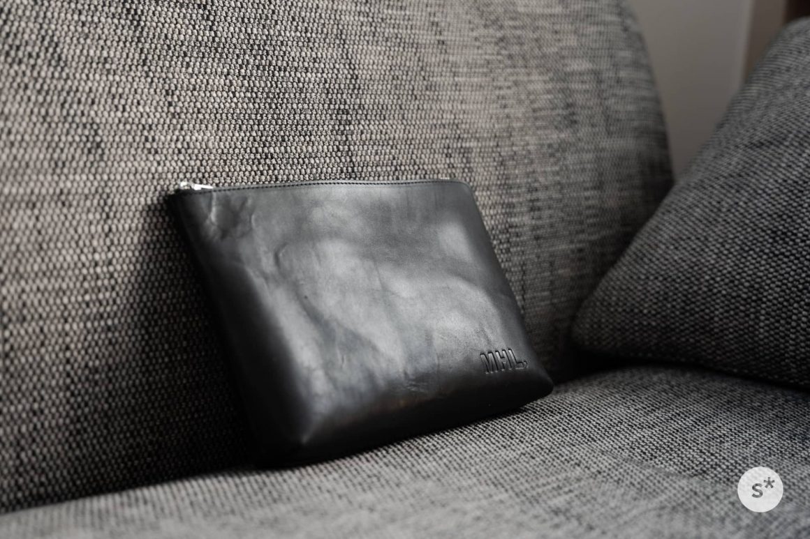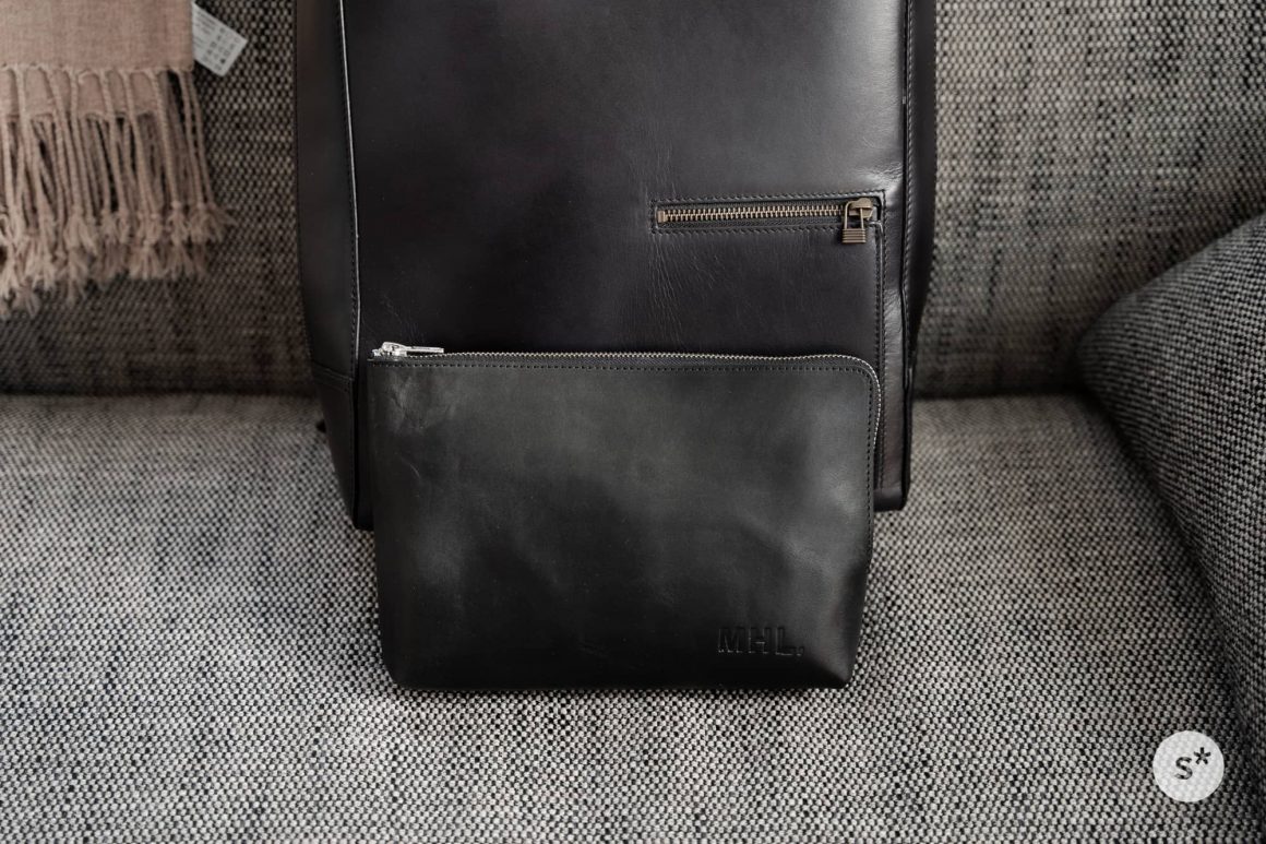 正面右下に「MHL」のロゴが型押ししてあるだけで、それ以外の余計な装飾はありません。シンプルなデザインが気に入りました。