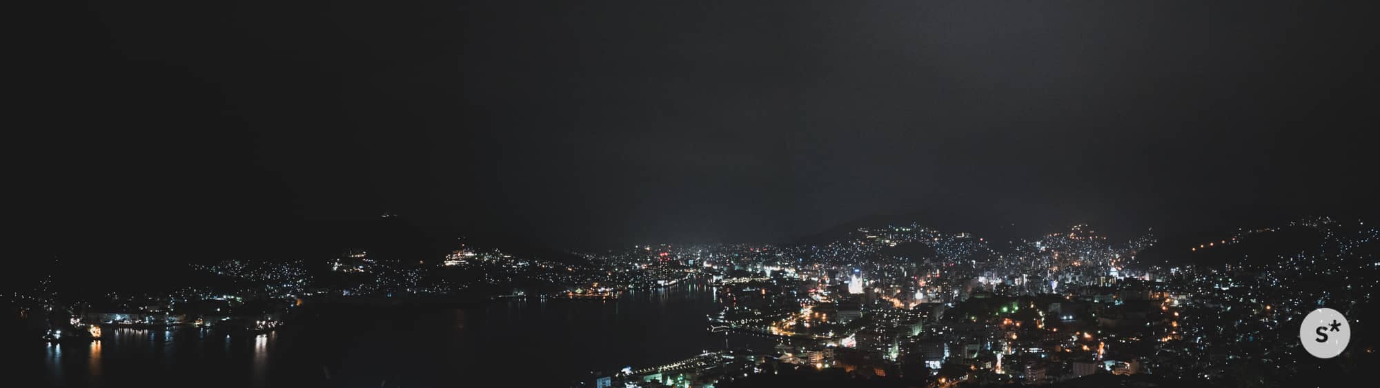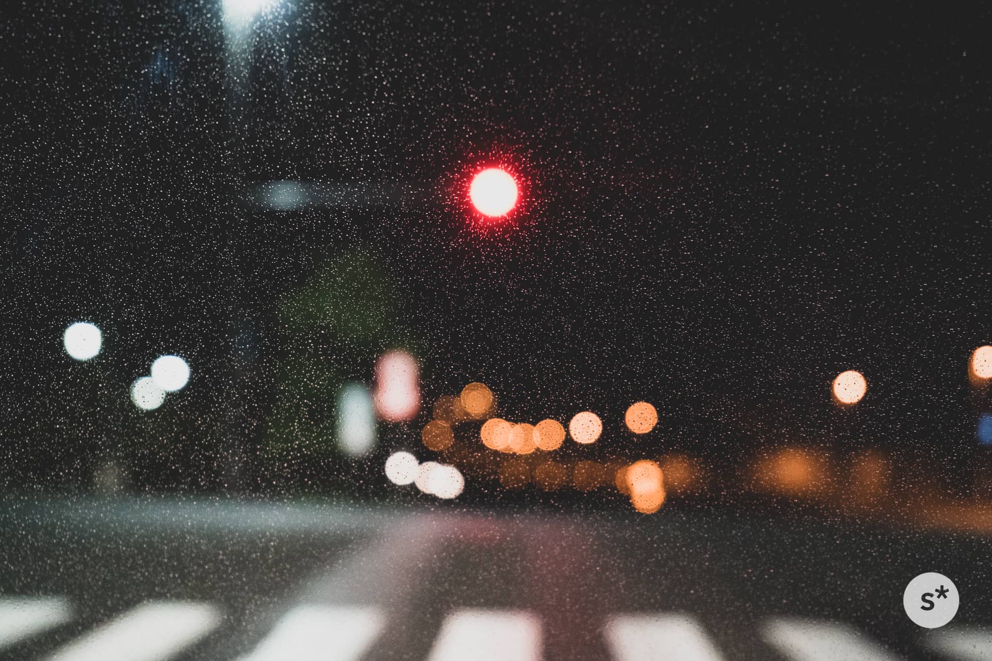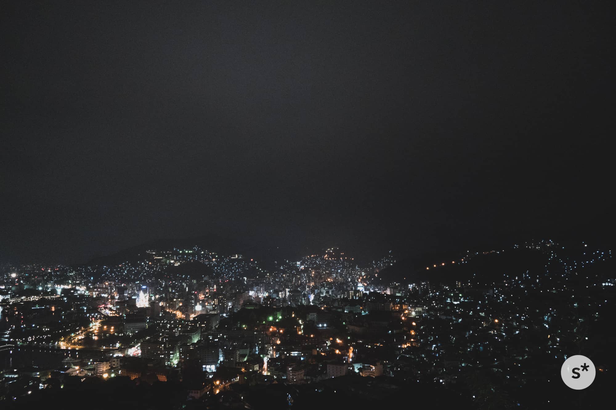 深夜で明かりが少なくなった夜景。雨で霞んでる。