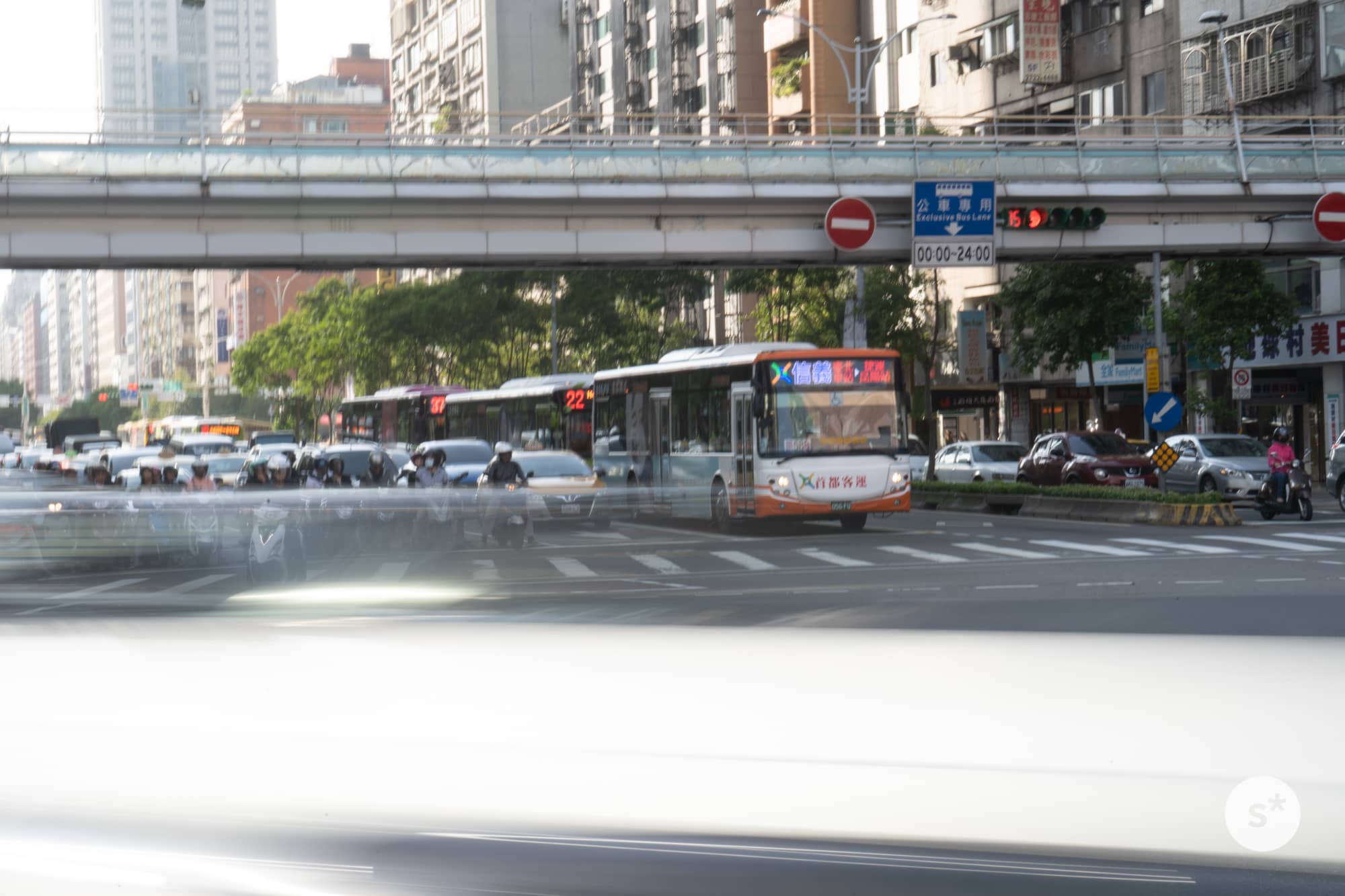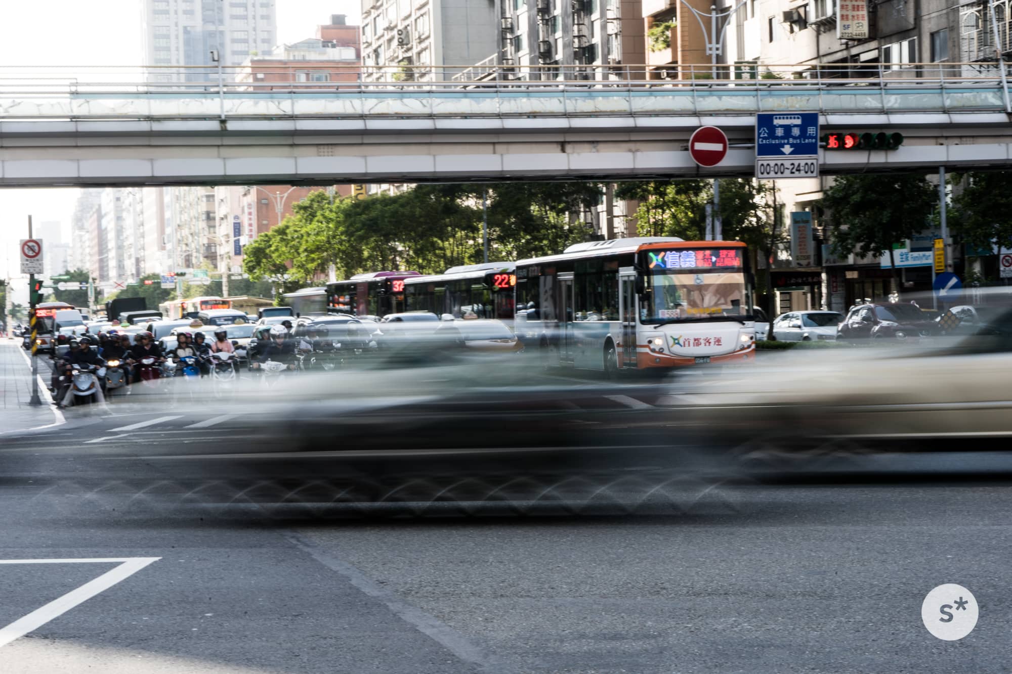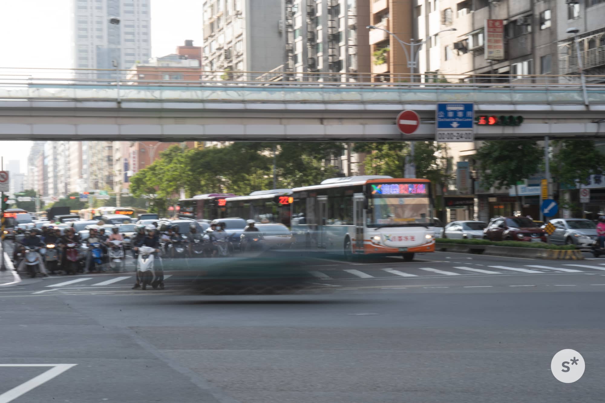 台北101のすぐ近くの交差点を駆け抜ける車を、シャッタスピードを長くして流し撮りしたかった。