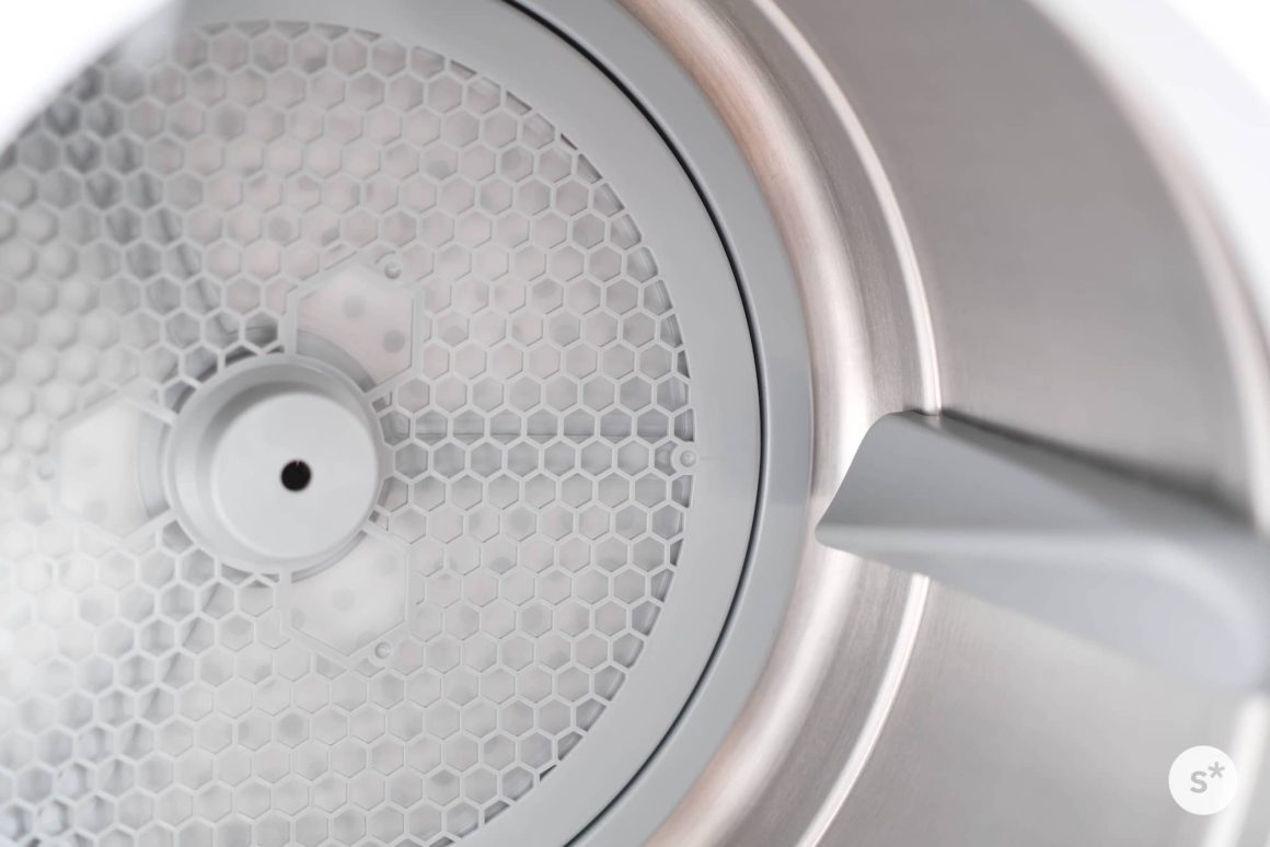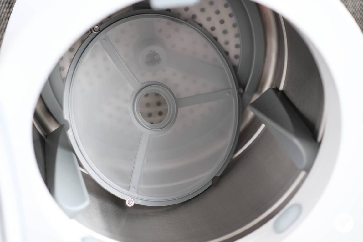 ドラムの奥にはホコリをキャッチするフィルターがあります。乾燥効率の低下や本体の故障を防ぐために、乾燥のたびに掃除した方がいいです。ハニカム構造のカバーが1枚あり、その下にフィルターがある、という2段構えになっています。