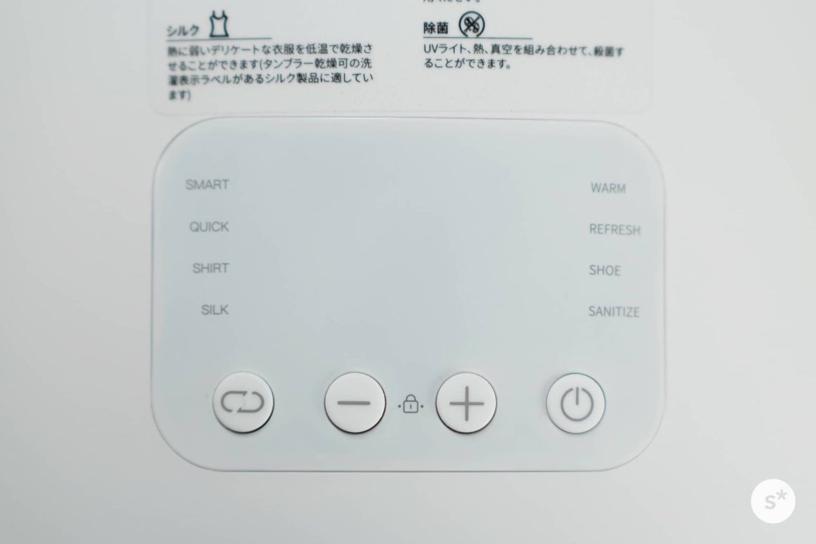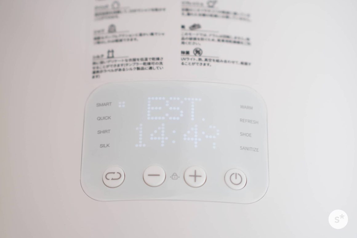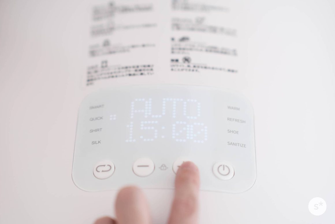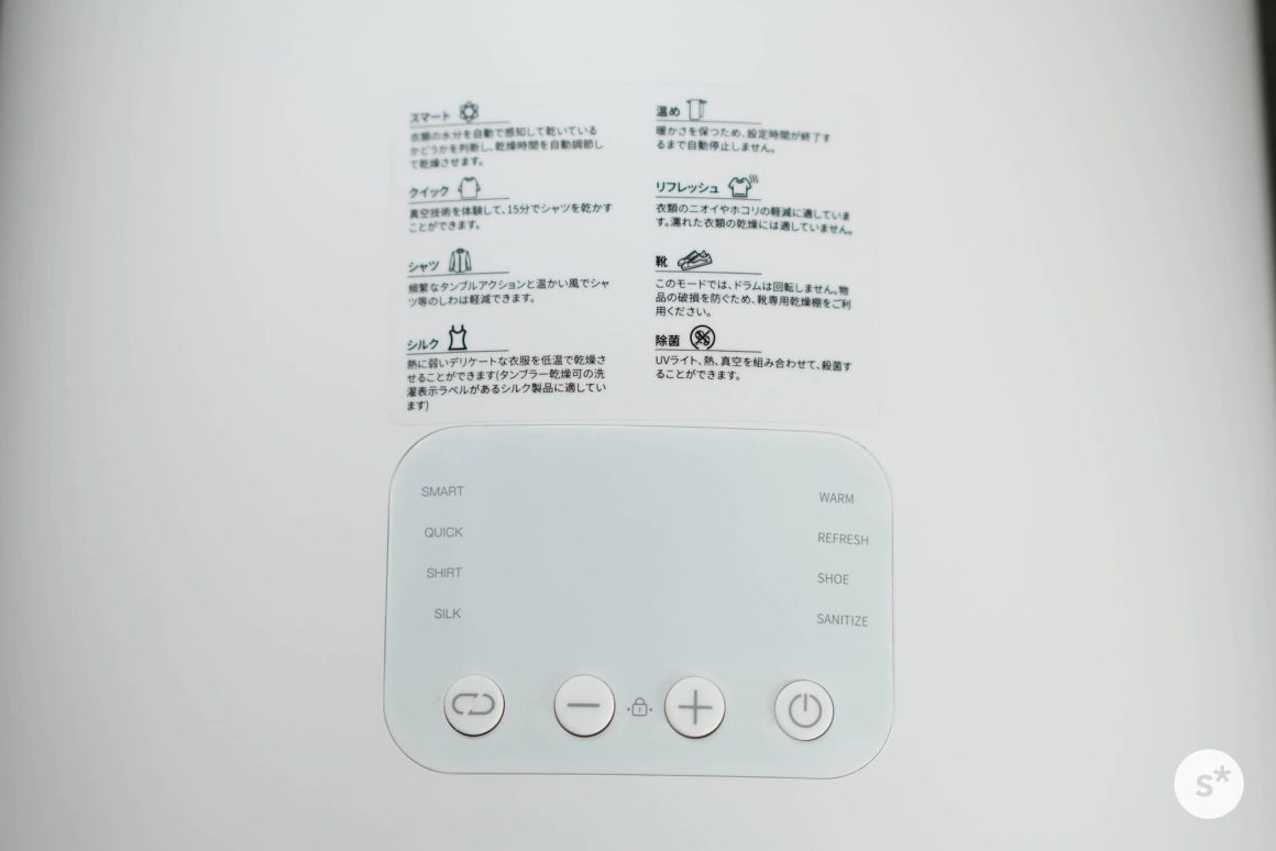 使い方はとても簡単です。乾燥する衣類を中に入れたあとは、電源を入れ(電源ボタン長押し)、モードを選択し、スタート(電源ボタン短押し)するだけです。スマートモードでよければモードを選択する必要すらないので、電源ボタンの長押し+短押しで乾燥が始まります。