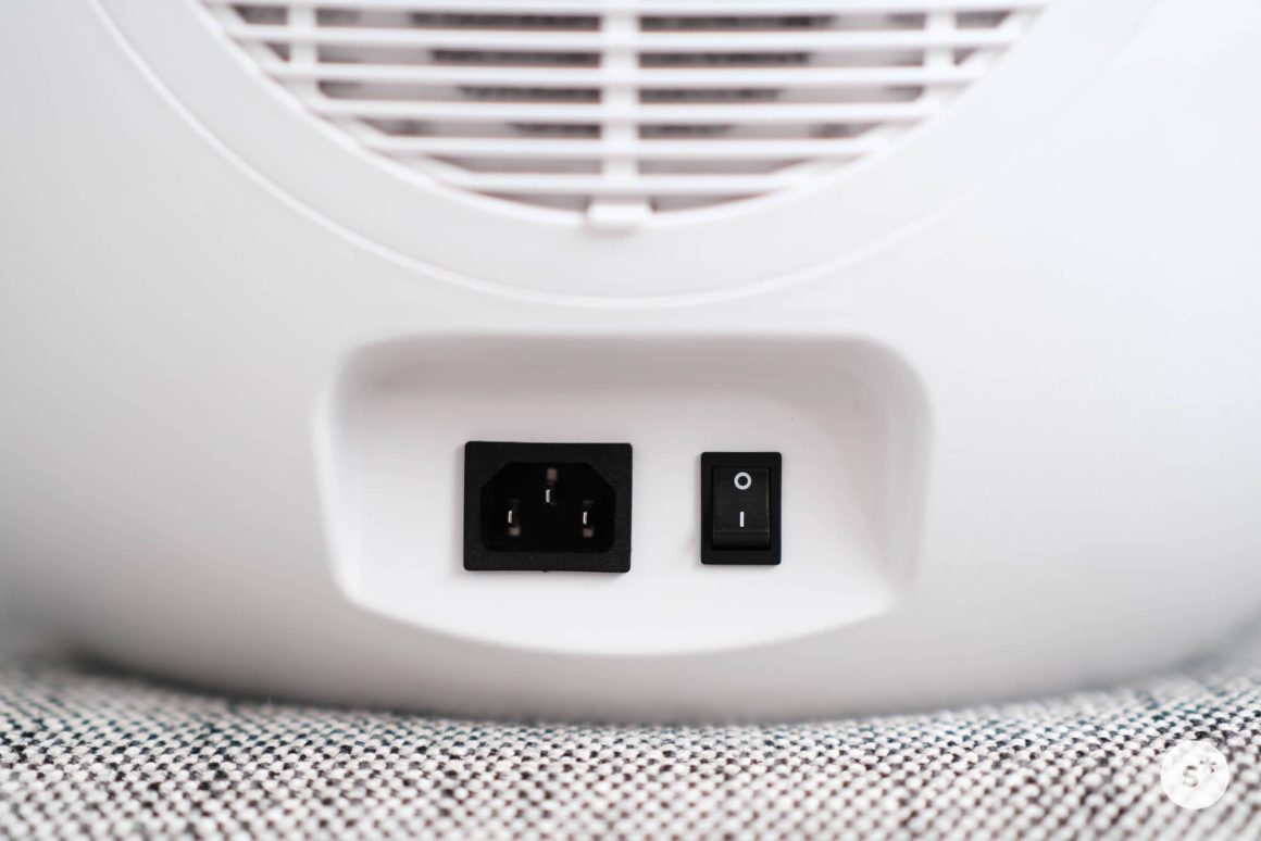 背面には吸気口や排気口があります。使用中はここから温風が出てくるので、壁にぴったりくっつけることはできません。また、その下には電源ポートと主電源があります。