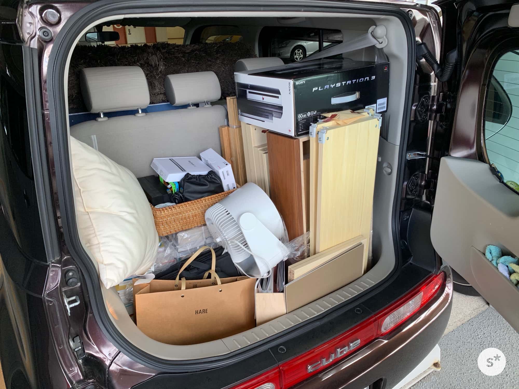 ちょうど車に載せる行程が終わりそうですが、日産キューブには予想以上に荷物が載ることがわかりました。