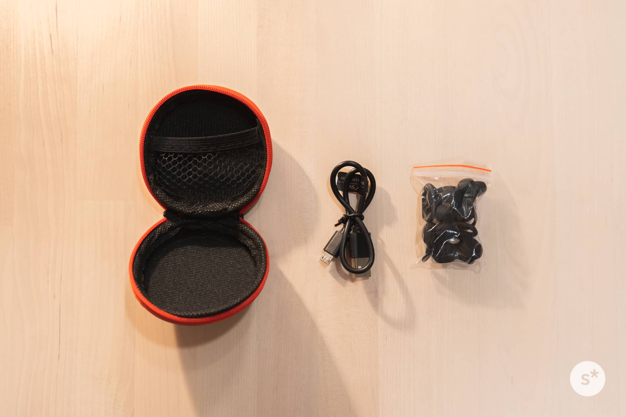 付属品は以下のとおり。充電用のUSBケーブル、交換用のイヤーチップとイヤーフック。チップとフックは分かれているので、それぞれ別々のサイズを使うこともできます。