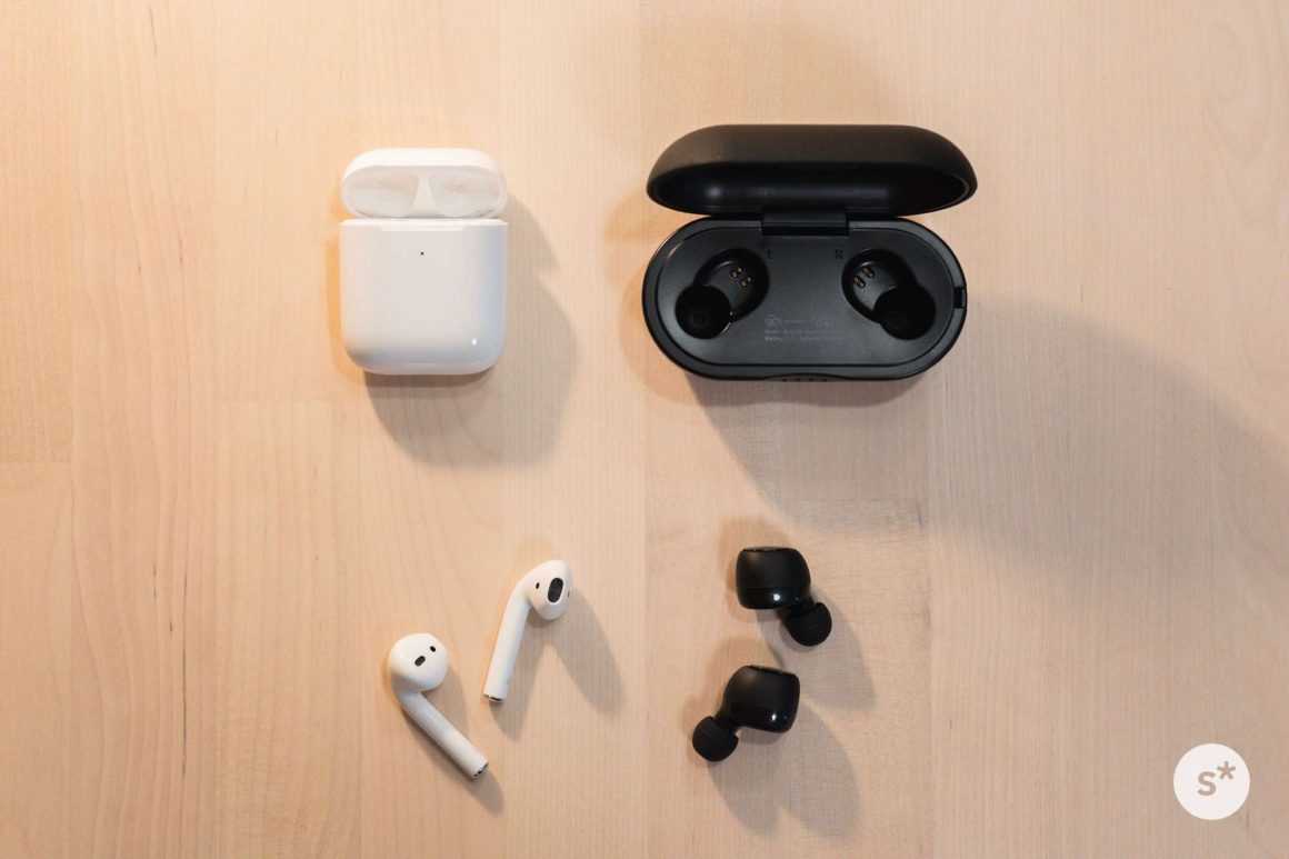 ケースに入れて充電するタイプの完全ワイヤレスイヤホンです。ケースはAirPodsより大きいですが、むしろAirPodsよりも小さいものを見たことがないので比較するのはかわいそうかな…
