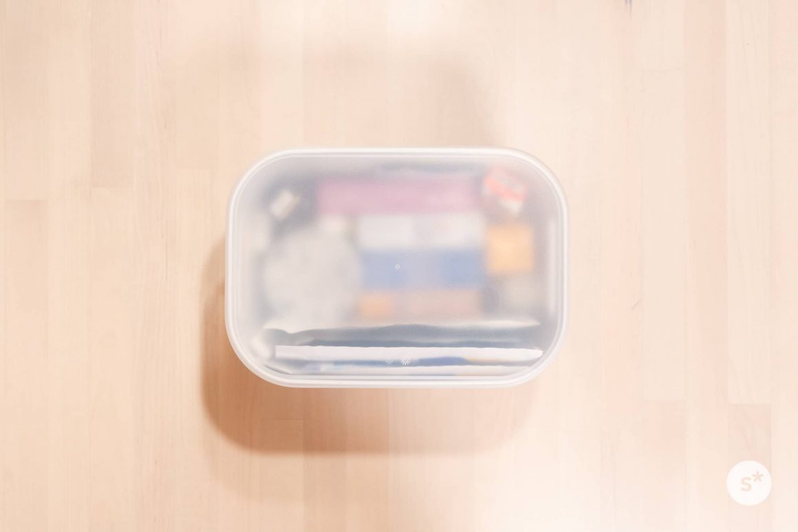 フタを開けるとこうなります。必要最低限ですが、よく使うものだけ入れてます。