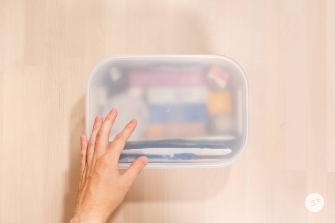 僕が買ったのは「ハーフサイズ」の「中」です。つまり、18 cm × 25.5 cm × 16 cm というサイズ感。中身が透けて見えるフタも買いました。