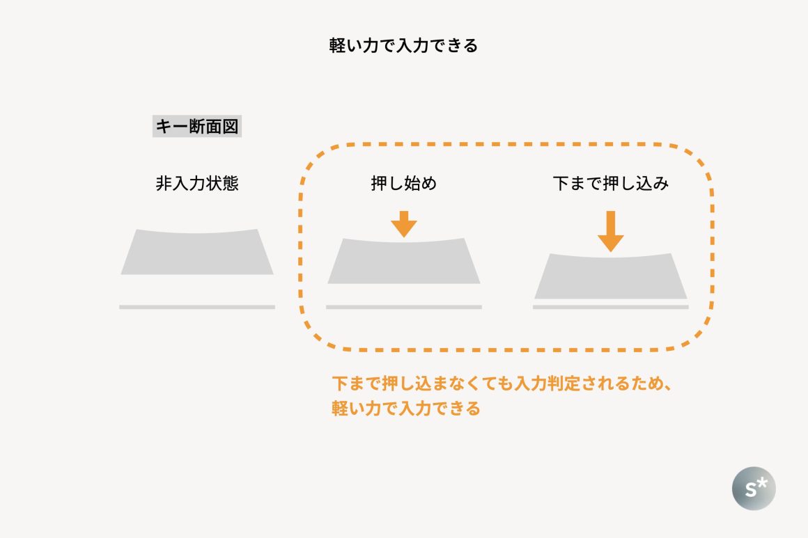 HHKBよりも浅めのストロークで、軽くキーを押しても入力が反映されるため、指への負担が少なく感じました。HHKBも浅いストロークでも入力判定されるのですが、HHKBは押し始めがちょっと固いような気がします。