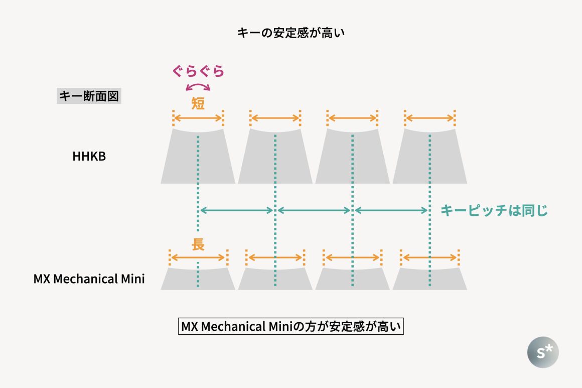 HHKBはキーが少しぐらつくことがありますが、MX Mechanical Miniはしっかり固定されており、安定したタイピングが可能でした。
