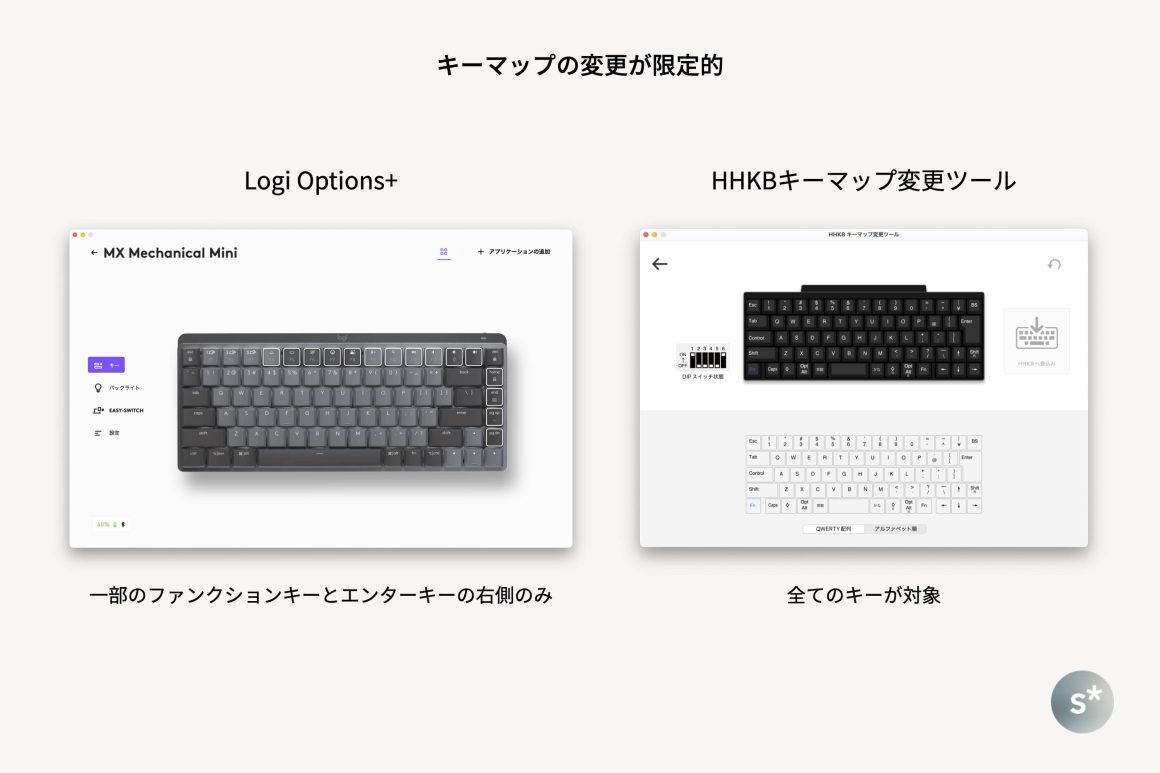 Logi Options+というアプリを使ってキーマップを変更できるのですが、その調整できるキーが限られています。具体的には、ファンクションキーの一部と、いちばん右側のキー(上で邪魔だと書いた列)だけを変更できます。あらゆるキーを変更できるHHKBとは対照的ですね。