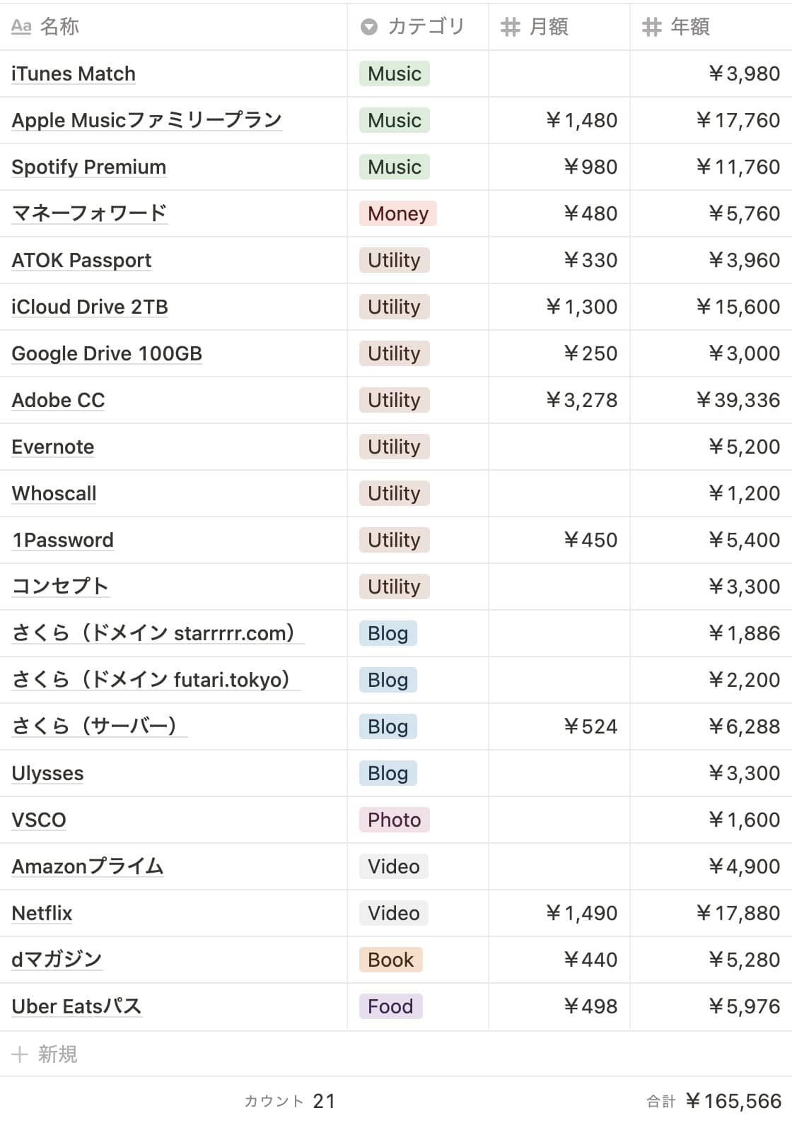 ということで、まとめると「全21サービス、年額165,566円」にもなりました。2018年に計算したときは121,584円だったので、4万円以上も増えています。全部が無駄とはいいませんが、さすがに高い気がするので見直そうと思います。