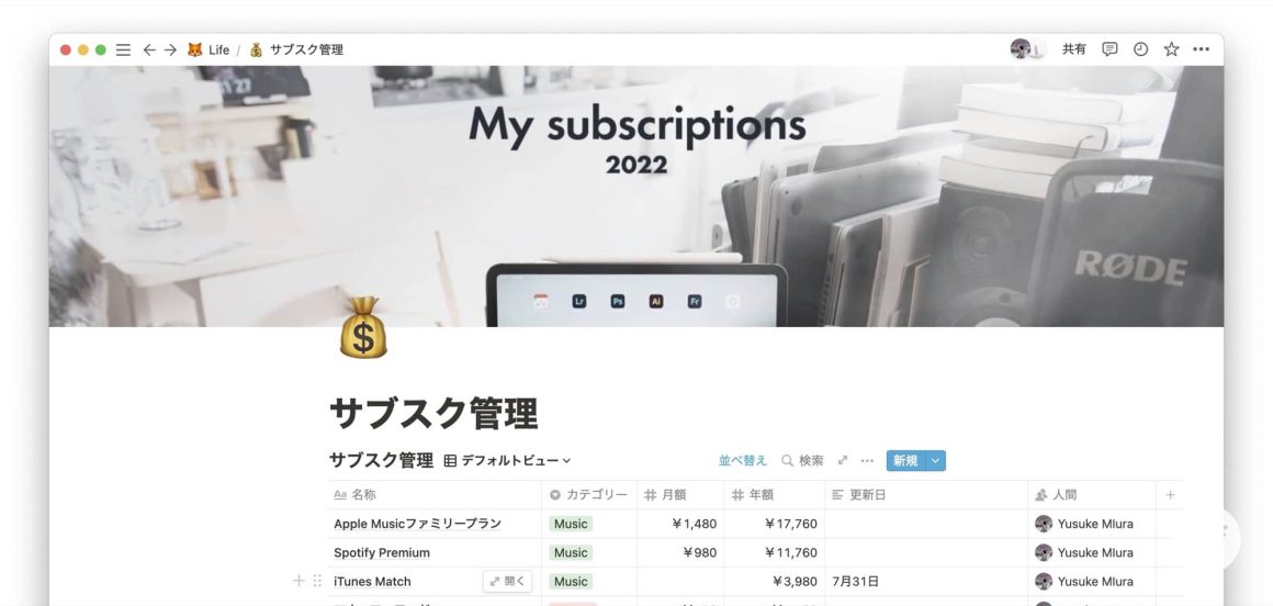 ちなみに、集計にあたってはNotionを使い、サブスクの名称、カテゴリー、月額、年額、年額の場合の更新日、契約している人を一覧にしました。2人で契約しているサブスクが見やすくまとまったので、このような管理にNotionを使うのははおすすめです。