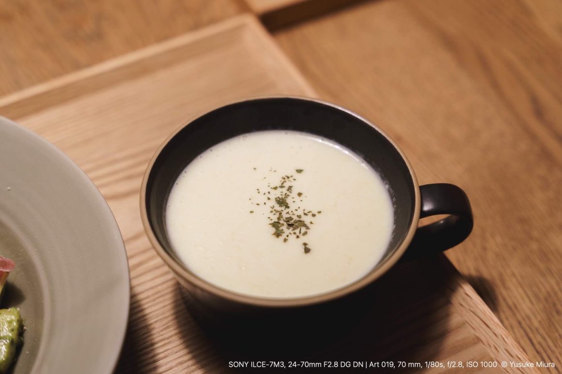 これは、ふぁーむわださんで買った「白い恵味」という品種をスープにしたものです。この品種は生のままでも食べられますが、試しに少し食べてみたところ、僕らは生で食べるよりも熱を通した方が好みだったんですよ。